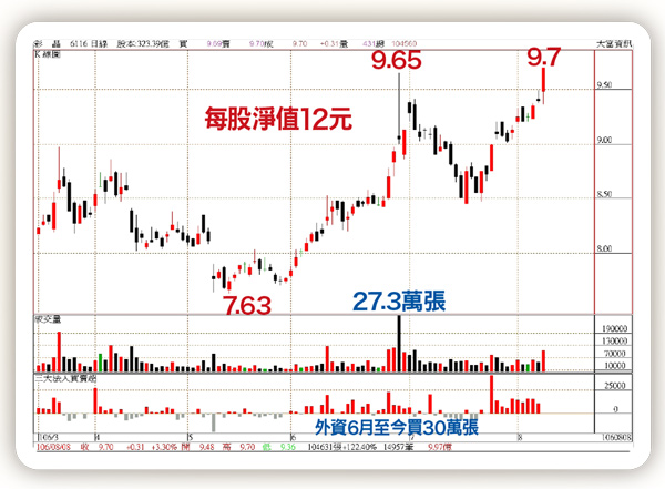 彩晶近期股價由七.六三元上漲至九.七元,並消化六月二十九日二十七萬張的套牢賣壓,將走出一波新多頭。近三個月外資不斷加碼買進,尤其八月八日大買三.二萬張,累計六月至今更大買三十萬張,是上市櫃買超第二名,每股淨值十二元,有機會測試。