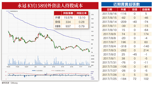 營益率否極泰來 具低基期優勢另外還有一種個股,營收開始止跌回升,營益率也由谷底翻揚,產業最壞的情況已過,可列入長線追蹤,例如永冠-KY(1589)。根據GWEC(全球風能理事會)預估,二○一七~二○一八年,全球預估裝機量為六八GW、七二GW,年增率分別為六.二六%與五.八八%,顯然過去的低迷市況已過,未來將緩步回升。永冠擴建江蘇鋼銳廠,將在今年年底至明年初完工,將可搶攻中國離岸風電大型鑄件商機;而上海鑄一廠設計產能為五千噸/月,今年年底達成二千噸/月,二○一八年全產能開出,屆時可望能紓解江蘇鋼銳廠的壓力。目前產業機械比重拉升(營收占比約三○%)。產業機械應用別有電動車、汽車產業等,訂單快速成長,至今產業機械需求仍然火熱,能見度已達一季之久,第三季將受惠於產業機械景氣,因此營運將不看淡,營益率已由第一季的七.四九%回升至第二季的九.二%,七月營收年增十.九二%,月增七%,最壞的狀況已度過,股價基期夠低,法人預估第三季營收為十九.八億,季增十七.一%,EPS估約二.○四元,將重回成長軌道。圖表五圖表六圖表七圖表八圖表九圖表十