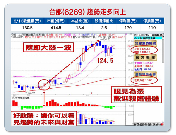 【個股推薦】台郡(6269)為蘋果台系三大軟性印刷電路板供應鏈之一。主要利基題材有:(1)第二季毛利率上揚,獲利優於預期:受惠新款平板與NB採用新的光電模組用軟板,第二季毛利率二四.三%,季增一.三%,淨利三.六六億元,季增四九.四%,EPS一.二七元,稀釋後一.二二元,優於預期。(2)法說報喜,下半年營收創新高可期:財務長熊雅士表示,受惠客戶端新機強勁備貨需求,加上台郡搶下電源管理模組、面板光電控制模組、光學與無線傳輸模組等新領域應用軟板,下半年展望樂觀,以生產與備貨量來看,第三季將可較去年同期二位數成長,以金額來看,年增幅度會更大,第四季又會比第三季好。熊雅士表示,今年單月營收最高月份,相較去年將晚四到六周,此一變化,也讓台郡今年第四季營收將高於第三季,同時樂觀期待明年第一季將可望淡季不淡。熊雅士進一步指出,下半年將回歸以手機為主力的戰場,預估營收可望逐季創新高,單月最高營收可望逾三十億元,去年單月營收最高為二四.五三億元,顯見今年第三季及第四季營收成長力道將會很強,單月營收最高將落在十一、十二月。台灣新廠第三季開始投產,預計投入先進製程,亦將成為推升今年業績成長一大動能。(3)為配合軟板業每五年一波新技術的發展,台郡宣布啟動未來三年,包含土地、廠房、設備等不亞於六十億元的投資計畫:所謂軟板新技術的發展,包括手機高階細線路軟板、20~25 micro以下線路製程、AMOLED與Micro LED用軟板,以及高速和無線傳輸用軟板等。配合法人力挺,籌碼面及技術面持續處於相對有利條件,後市仍有再創新高空間可期(※基本面資料若有異動,依公開資訊觀測站最新訊息為主)。【操作建議】低接不追高,除權息後,只要守穩一一○元關卡不破,逢低於富貴線附近,不管破與不破,仍值得留意,在趨勢走多不變下,搭配盤勢止穩、控盤指標翻紅,且攻擊力道轉強,後市隨時可望有一波大漲行情機會可期,設好停損停利(詳見附圖說明)。