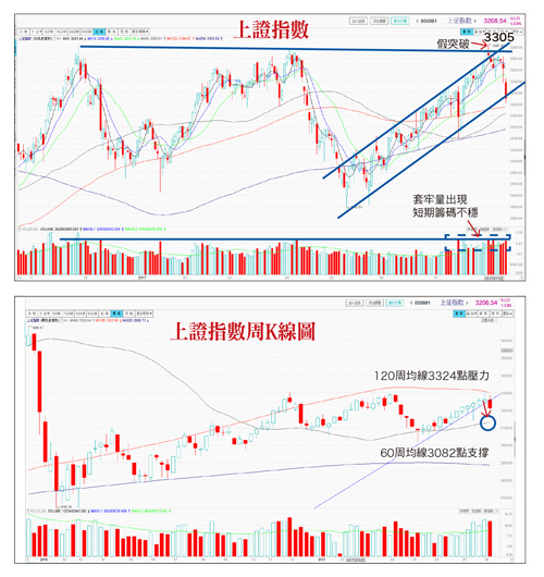 北韓還擊川普的嘴砲恐嚇,威脅火力包圍關島─四彈齊發,八月十日VIX恐慌指數暴衝四三%,為五月以來新高,道瓊指數下跌二○四點,那斯達克指數跌二.一三%,有疑似盤頭的疑慮,特別是五大科技龍頭股的亞馬遜與Google領先跌破季線,微軟回測季線,蘋果有假突破後的回測可能性。A股八月多頭指標轉向由於國際股市出現居高思危的重挫,拖累上證A股也出現波段漲勢結束的訊號。八月十一日上證指數連續第三天收下跌陰線,雖然守住上升軌道線支撐(半年線),但八月二日的三三○五高點正好遇到一二○周均線(三三○一點)壓力,有假突破的跡象。從周K線的量能來看,八月九日至十一日連續三天的下跌屬於止損賣壓湧出的徵兆,三二八○點正負三十點已形成大量套牢區,因此就周K線的角度,不排除下探六十周均線的三○八七點支撐。從板塊的輪動來看,六至七月領漲的週期股(景氣循環股)已經開始出現漲多之後的雜音,部分資金流出開始著墨蘋果概念、雄安新區、生物醫療、軍民融合、區塊鏈等板塊,估計八月份的多頭指標會逐漸從週期股轉向蘋果概念與雄安新區等板塊。