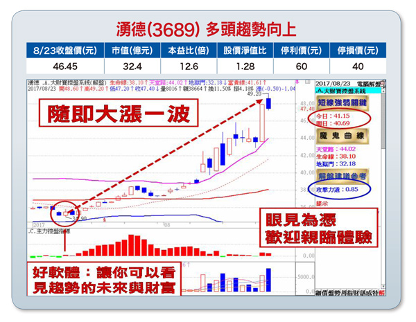 【個股推薦】湧德(3689)為訊號連接器製造商,主要訂單來自網通及遊戲機領域。競爭優勢:專利技術在於整合電子及機構件技術,除晶片、電感、電容為外購,其他零組件均為自製,在整合電子及機構件並將防電磁波及雷擊的濾波器包至RJ45整合型產品內,使訊號連結更順暢,亦可節省應用產品內部空間;製程採焊接自動化、測試製程自動化及繞線等核心零組件自動化生產,產品不良率降至○.二%以下。主要利基題材有:(1)自動化效益發酵,營運看俏:湧德近年營運重心放在自動化的調整,第一階段利用五年時間導入機器手臂,將組裝線的自動化程度拉高,第二階段則是透過濾波器的優化設計,拉高模組自動化程度;預估只要組裝產線自動化程度提高一成,毛利率將可望貢獻○.五至○.八個百分點,模組自動化提高一成,毛利率亦有約一個百分點的貢獻。受惠自動化滲透率攀升,預估今年可上看四成,生產人力總數降至五百至一千人,人事成本有效降低,可望帶動毛利率大舉提升逾十個百分點,加上RJ45-2.5G新產品搶進雲端商機並開始交貨,價差較1G產品高上一至二倍,帶動第二季EPS繳出一.○二元佳績,季增四三.七%,年增二.五二倍,在營收規模回升下,全年獲利成長估將有挑戰逾六成的機會。(2)外資買盤加持,低檔一路默默吃貨回補庫存,加上股價處於歷史相對低檔,技術面為相對有利位置,有利股價持續向上(※基本面資料若有異動,依公開資訊觀測站最新訊息為主)。【操作建議】低接不追高,守住四十元關卡不破,逢低於富貴線至天堂路之間仍可留意,惟在趨勢走多不變下,只要攻擊力道能夠翻紅轉強上來,後市仍將有一波大漲行情可期,惟基於風險考量,各位在操作上仍務請善設好停損停利之機制(詳見附圖說明)。