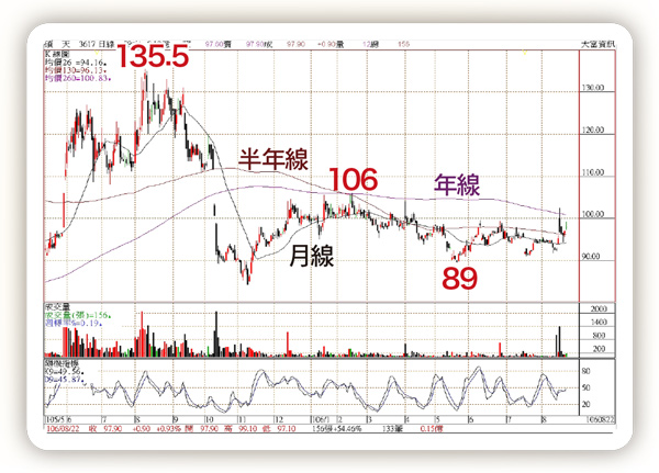 八一五全台大跳電,突顯出台灣電力的不足,及電力設備的問題,這不但是國安問題,更是經濟發展的問題。非核家園是夢,轉換替代能源的過程中,電力不足令人擔憂,八一五的突發狀況,反而增強很多家庭及公司對UPS(不斷電系統)的重視,未來市場需求會增加。碩天(3617)主要產品:不斷電系統、電源分配器、電源轉換器、電源突波保護器、電源管理軟體,以及行動周邊充電器,自創品牌Cyber Power,不論針對專業IT設備、中小企業用戶或一般家庭消費電子產品,碩天都提供完備的解決方案。碩天股本八.一億,二○一六年營收七十億,營收/股本周轉率八六五%,營運效能強,而且連續八年營收創新高,年成長率都達一○%以上,今年前七個月營收四二.五億,年增六%,產品毛利率高達四四.八%,獲利能力強,二○一六年EPS九.○二元創歷史新高,是高成長、高獲利的公司。今年台幣升值的影響,上半年EPS仍保持三.三元,下半年是營運旺季,全年可保持八?九元高獲利,以八月二十二日收盤價九七.九元計算,本益比僅十一倍,具投資價值。股價去年自一三五.五元下跌後,已連續十一個月處於一○五至九十元間箱型整理,目前股價站上月線九四.一元及半年線九六.一元,未來只要再站上年線一○○.八元便形成多頭排列,有機會再發動一波新的多頭行情。董監事大股東持股五五.三%。