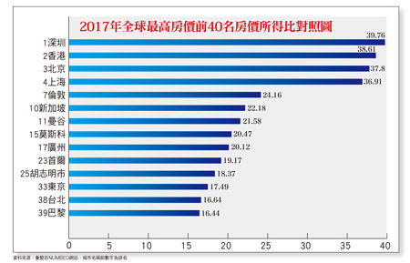歐美從嚴審查陸資 台灣怎可輕言開放若再退一步想,最近中國資金大舉外逃,若能經由三角貿易轉進台灣房市,即使貴個一、二成,就算是繳點保險費也還划得來。就以「萬通台北2011」為例,該案所在位置素有「台北八掛山」封號,主要原因即在於上一波不景氣,曾有八家建商在那個山頭上推案宣告滑鐵盧,其後又為何「萬通台北2011」可以每坪五十至六十萬之高價順利銷售?一言以蔽之,幾乎都是陸資購置所致。其次,如再就近年美國、英國、加拿大、澳大利亞、紐西蘭等國家,相繼嚴格審查陸資併購企業與限制購屋的作法,最直接的原因當然是兼顧國家安全與社會安定,歐美國家尚且如此,台灣還有什麼本錢可以輕言開放?關鍵時刻再不動作 香港經驗很快移植台灣另外,再從另一角度加以探討,當前台北房價高居全球第四十五位,今年第一季台北市房價所得比仍高居十五.五二倍,貸款負擔率更高達六三.九%,真不知政府有何錦囊妙計可以消除民怨?現階段正值景氣轉折之關鍵時刻,如再放任陸資或有錢人炒房,很可能香港經驗很快就會移植台灣。最後再來看看最近國際知名NUMBEO網站所公布的房價所得比資訊,最高前四十個城市當中就有五個分屬中國城市,前四名分別為深圳三九.七六倍、香港三八.六一倍、北京三七.八倍、上海三六.九一倍,至於台北則為第三十八位十六.六四倍(請參閱附圖)。現今中國超高房價所得比的數據,可以提供我們什麼啟示?看看世界,想想台灣!國安、社安與房價,孰輕孰重!