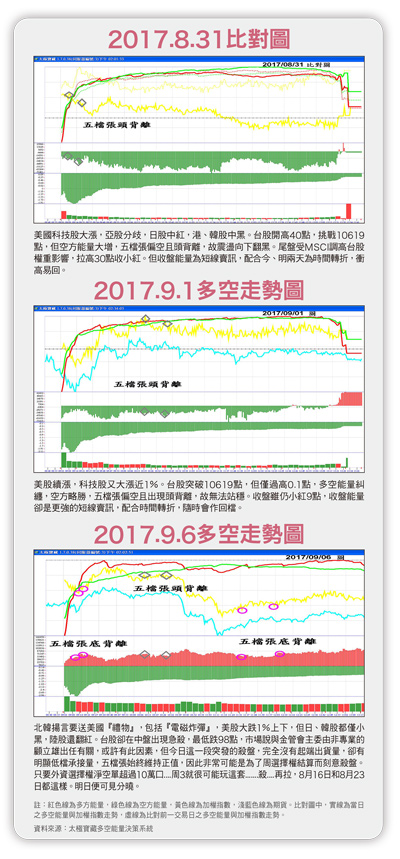 上周本欄已清楚說明,八月底九月初應可挑戰波段高點一○六一九點。但以能量來看,無論一○六一九點過與不過,都容易衝高後壓回。目前並不認為會就此扶搖直上,而是在高檔進行八至十三天的強勢整理,做最後誘空,再一舉軋空。上周四(八月三十一日)美國科技股大漲,亞股分歧,日股中紅,港、韓股中黑。台股開高四十點,挑戰一○六一九點,但空方能量大增,五檔張偏空且頭背離,故震盪向下翻黑。尾盤受MSCI調高台股權重影響,拉高三十點收小紅。但收盤能量為短線賣訊,衝高易回。上周五(九月一日)美股續漲,科技股又大漲近一%。台股突破一○六一九點,但僅過高○.一點,多空能量糾纏,空方略勝,五檔張偏空且出現頭背離,故無法站穩。收盤雖仍小紅九點,收盤能量卻是更強的短線賣訊,配合時間轉折隨時會作回檔。上周五歐美股市續漲,美國Nasdaq差十一點就創歷史新高。但盤後北韓試爆氫彈,本周一(九月四日)美國電子盤下跌,日、韓、港股皆跌,台股小跌二十四點,能量仍為短線賣訊,仍會震盪拉回。九月五日美股休市,電子盤跌幅縮減,亞股小紅小黑,台股能量與五檔張偏多,但成交量不足,小紅狹幅震盪,最後一盤突然拉升二十三點收最高。既非結算又非作帳,這拉
