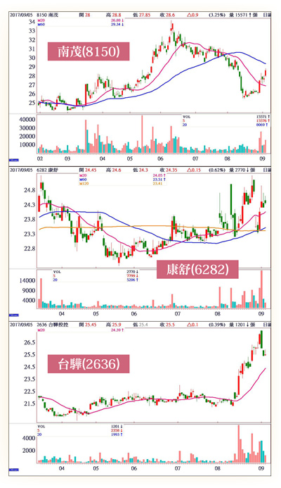 目前中國正積極發展的項目,如半導體、面板、手機、電動車、記憶體等,但這其中多檔概念股已大多漲了上去,如彩晶(6116),從當初學員買的九.二元,漲到現在已經十三塊多了,如華邦電(2344),從當初開始進場的十九.一元,漲到現在已經二十五元了。當股價漲上去之後,投資價值就會降低,與其考慮要不要再追進,不如尋找還沒漲的潛力股,畢竟低檔布局賺最多。這裡所談的中國概念,跟過去不同的不再是只有通路,過去的藍天、神腦等,已不再是中國合作的重點,取而代之的是與中國公司有入主或策略聯盟的方向,共蒙其利。南茂(8150):南茂的背後有中國最大的紫光集團,而紫光集團將很有可能在未來成為全球半導體芯片的龍頭,接下來在十一月的中國十九大代表大會,半導體發展的經濟政策也必將是其中一環。就第四季來看南茂,在電子旺季的帶動下,下半年營收應該不錯。操作策略,短線上八月三十日至三十一日連兩天帶量攻擊,視為低檔反轉訊號,接下來呈現高姿態整理,還有攻擊向上的空間,待股價上攻至下彎季線時,可先獲利下車,中長線投資人則採取回測月線低接,目前股價已在打中線的底部,長多格局。康舒(6282):同為Tesla供應鏈,也是主要在大陸建置充電樁的重點廠商,除本業有政策上的發展利多之外,業外也因為處分東莞的閒置廠房土地,而每股貢獻約四.五元,這一部分不會這麼快入帳,卻也讓接下來的獲利好看許多,最重要的還是大陸政策下的受惠。技術面,股價整理兩年沒有動,中長線最近剛正式向上翻揚變多頭,短線由於遇兩年大頸線,因此陷入整理,待整理後再攻擊。台驊(2636):與中國大連港歐陸國際物流公司簽署戰略合作備忘錄,是台灣唯一少數能吃到大陸物流商機的公司,雙方合作後,台驊主要提供台灣、日本、韓國、東南亞海運至大連港,再通過海鐵聯運至俄羅斯、白俄羅斯、波蘭、德國等地的過境中轉全程服務,同時包括過境貨物在大連報關、集裝箱換裝、拼箱、倉儲和保稅等,隨著進入中國一年一度最大的消費旺季,營收將進一步成長。操作策略:短線上股價先前漲過一波,待回測月線後再行低接。
