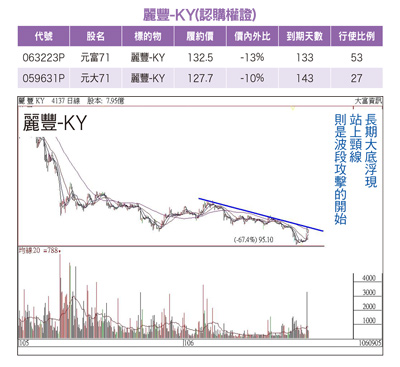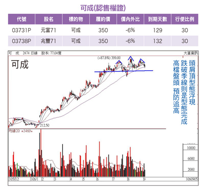 高位階蘋概股 留意認售權證發動機會面對這種高檔震盪以及東北亞的政經情勢不穩定,很多投資朋友在操作上會失去依據,因此權證則是一個很好的投資工具,因為不需要花太多資金,卻能達到比股票還要高的利潤。本期我們針對低檔位階的生技股介紹一檔認購權證,而對於高位階的蘋概股,則建議留意認售權證發動的機會,投資朋友可以留意高低位階對於認購/認售權證的進場時機。