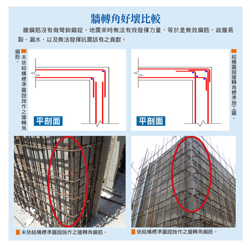 在銷售市場中時常耳聞業者以使用的鋼筋數量多寡,來作為其建築安全品質的指標宣傳,這樣的建築就一定安全嗎?其實不然!「優良的結構規劃設計」與「精準確實的施工品質」,才是一棟建築安不安全最重要的關鍵,絕對不是用很多鋼筋就一定安全,唯有將每根鋼筋的施作位置及彎鉤都做到精準定位,每根鋼筋的強度才能有效完整發揮,建築才能真正安全。倘若放一堆鋼筋在不對的位置或在該有的接合或彎鉤沒做到位,這樣就沒有辦法讓這些鋼筋真正發揮力量強度,不但對建築安全沒有幫助,反而因為鋼筋太密造成混凝土澆置不易而產生蜂窩現象,及增加結構自重,嚴重影響建築之整體耐震能力,對建築安全而言,反而未蒙其利先受其害。鋼筋綁紮工資、混凝土材料 有等級、價格差異影響建築安全的鋼筋部分,除了鋼筋數量外,鋼筋施工品質及鋼筋與混凝土材料的好壞也相當重要,比如說鋼筋綁紮工資、混凝土材料也都有等級與價格上的不同差異,這些都應同時考慮,建築才會較安全。以鋼筋綁紮的工資而言,從每公噸三千多至上萬元不等的價差,大家也都號稱品質符合法規規定,若是一個建築工地施工時,業主只願意給出三千多元的鋼筋綁紮工資時,以每天綁紮多少噸鋼筋來計算工資的工人,那他的施工品質一定會相對草率,可能使柱鋼筋定位綁紮不確實、柱箍筋該鉤的鉤角度不夠、柱箍筋間距應該十公分者卻放大間距、