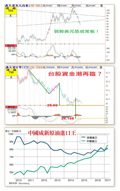 國際股市近期持續震盪,主要原因在於美元指數的轉弱,美元的轉弱在向市場預告著未來FED在資金緊縮的態度上會比原先預期更緩慢,從目前美元指數的技術型態來看,幾乎已經可以宣告弱勢美元的時代又再次來臨。而弱勢美元有其形成背景:(1)川普政府一兆美元的基礎建設;(2)因颶風侵襲德州、佛州,造成石油價格反彈向上;(3)東北亞政局不穩,黃金避險需求上升;(4)歐元、人民幣的升值。以上都是形成弱勢美元的主要原因,弱勢美元也符合川普過去對美元的態度,在FED副主席(鷹派)費雪請辭,以及主席葉倫任期即將到期的情況下,一般市場預期川普將挑選有利自己的FED主席人選,對市場來說美元的未來是偏弱的。匯率為經濟雙面刃美元指數偏弱,相對於新台幣的匯率就是升值為主,只要看到新台幣升值,資金就會自然地流入到台灣市場,對於台股行情支撐就有明顯的效果,台股之所能夠走出萬點行情,原因就是新台幣的持續走升,從短線新台幣已經升破上回二九.九三五大關來看,中線可望挑戰看到二十八元關卡,但這只是對於未來行情的規劃,還要靠短線一步步的驗證才行。還是得要提醒大家,新台幣升值雖然可以帶動資金行情,但同時也會導致電子股出現匯損,除非真的可以看到全球有效需求強勢走揚,否則在資金行情的背後,就是當財報公布時,企業的大幅度匯損所帶來的大地雷的隱憂。