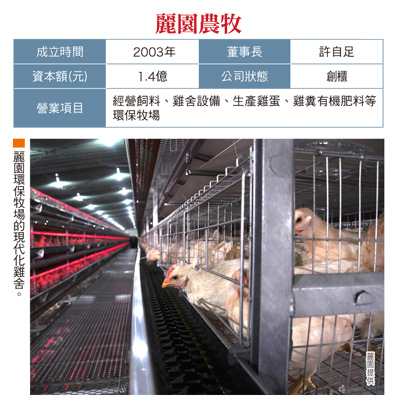雞糞轉換成有機肥料,一年商機可達六十億!找到這項雞糞商機的,就是麗園農牧科技公司董事長許自足。位於高雄阿蓮區的麗園牧場,是座「只聞雞叫聲,不聞雞屎臭」的蛋雞牧場,加上連結著一座雞糞肥料廠,讓有機質肥料回歸至大地,成為取之於自然,用之於自然的環保牧場,這就是牧場主人許自足投注十四年的心血結晶。十四年前,許自足從老師職務上退休,在思考人生第二春時,有朋友告訴他,「土雞蛋很好賺,只要投入兩千萬就足夠了。」於是,他真的籌措現金,創業當雞農。只是沒想到,這場投資成為不歸路,如今,十四年來已投入上億元。二○○三年以「美麗的家園」命名,成立「麗園牧場」。從飼料、雞舍設備、環境等,一點一滴上下整合,更全面採用歐洲水簾溫室微控;並在飼養蛋雞同時,也投入後段雞糞處理,幫助土地保有原來的生命力。同時,為了供應優質雞蛋給更多客戶,二○一一年推出歐洲人愛吃的紅殼雞蛋。研發雞糞環保工廠麗園為了確保雞隻的健康,將當天孵化的一日齡雞送至小雞舍自行飼養。並堅持採用日本模式,每天清理雞糞,送入經九年研發,花五年時間自行規劃獨有的雞糞環保工廠,將符合法令的有機質肥料回歸至大地,成為名副其實的「環保牧場」。在飼養蛋雞的同時,也投入雞糞減碳工作,研發製程僅十七天,即可完全發酵的有機質肥料。麗園參照國際環保雞舍模式,以適合台灣溼熱氣候,採用歐洲水簾溫室微控,建立有機肥料廠,在廠內將雞屎轉化成有機肥料。透過這項專業技術,更於二○一三年在台灣、越南、馬來西亞蓋設大型雞糞環保處理工廠。乾淨的雞舍,不但讓麗園牧場生產出三百六十五天全年無藥殘的雞蛋,二○一三年也通過碳足跡認證,證明雞糞百分之百轉換成乾淨的有機質肥料,可以為每顆雞蛋降低六四.九%的排碳量。二○一○年,麗園開始建立自有品牌,透過電子商務平台,打開市場能見度。二○一七年,並開始投入種稻的工作。雞糞有機肥料工廠是麗園未來的「金雞母」,經過十來年的研究,目前已掌握多家國外有機肥料整廠輸出業務。而蛋品的銷售,透過產銷履歷驗證、產地直送業務、提供飼養全程不添加藥物及抗生素的安全雞蛋食材,新客戶大幅度增加六六.七%,回購率也達至九成以上,網路商店、官方網站營業額較去年同期也成長了六成三。