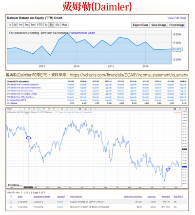 接續上期,持續用範例來驗證解釋,為何要用箱波均控盤戰法這類的技術分析來研判趨勢,以破除基本面分析的盲點。學員的持股中另外一個例子是買進後堅持持有,由虧轉盈創新高,但因自己評估基本面及財務數據,認為價值仍然低估,沒有達到出場條件,沒想到漲不上去後又頻頻下跌,最後虧損出場,說明如下:德國的戴姆勒(Daimler)是生產Benz汽車的公司,在美國有發行ADR於OTC市場交易(代號:DDAIF),近年ROE約在一七%上下,算是很不錯。戴姆勒是世界第十三大汽車製造商和第二大卡車製造商,他們家的Benz車子滿街跑,常見的大卡車、垃圾車牌子「FUSO」,mark是打三菱,但背後老闆是戴姆勒汽車公司。二○一四年六月至二○一五年三月,四季EPS累計$9.446,股價一百美元本益比也才十.五八倍,以股東的角度來看,真的是股價很便宜的大公司。二○一四年進場時,本益比算起來很低,沒想到股價並沒有因為本益比低就跌不下去,大盤跌也是跟著跌。持股續抱,總算等到回漲到一百美元,算起來本益比十二倍不到,當然續抱,嘿嘿…期待至少十五倍。接著股價向下修正,跌破買進價位,二○一五年九月受福斯汽車排放廢氣檢測造假事件延燒影響,又創波段新低,之後有拉回接近成本價,但後續無力,至二○一六年十一月,本益比才八倍。
