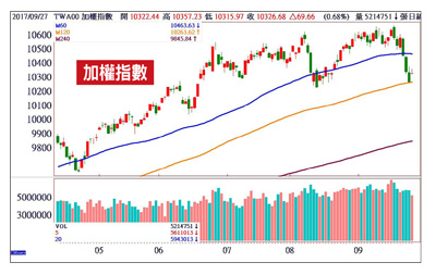 該來的中段整理修正就是跑不掉!台股過去一個月走出擴散三角形的整理型態後,果然在九月十九日創下一○六六四點新高後,隨即反轉下殺,並直接摜破季線來到接近半年線附近。而過去這段期間,市場有九成專家還一直鼓吹投資人在一○五○○點之上進場全力追價作多時,只有筆者獨排眾議,在一○五○○點之上建議大家跟著三大法人特別是外資的腳步逢高站賣方,近日大盤果然又急殺跌破一○三○○點來到半年線上下。而來到前低一○二二五點上下或有反彈,但真的能守得住嗎?10500~10664之上 套了約二.五兆籌碼就線論線而言,上一次八月十日收盤長黑跌破季線,八月十四日最低來到一○二二五點,之所以還能重新站回季線,再拉到一○六六四點稍微創高做右肩,主要是當時季線仍扣低上揚。加上蘋果(AAPL.US)新機發表前,市場一堆專家還心存僥倖以為蘋果新機發表後,蘋概股會大漲帶領台股上攻一萬一千點之上。不過,一來這次季線已要下彎,二來上檔一○五○○至一○六六四點上面套了大約二.五兆元的籌碼,而且大多套到散戶……