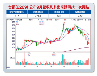 歷史果然再度重演,蘋果新機發表果然利多出盡、蘋概股拉回整理,加上iPhone 8賣不好、iPhone X出貨遞延,下修蘋概股今年營收、獲利和目標價,然後因明(二○一八)年上半年淡季不淡上修明年出貨量,早已是法人圈的共識。如此,蘋概股當然是逢高先賣,修正至年線上來確定落底再買回來賺價差。相信從一四○元的台郡(6269)、八十五元的景碩(3189)以及一一七.五元的鴻海(2317),都已經驗證我們的看法和作法是對的了。所以針對現階段台郡的操作建議,反彈十日線至月線站賣方,年線百元上下再來找買點。