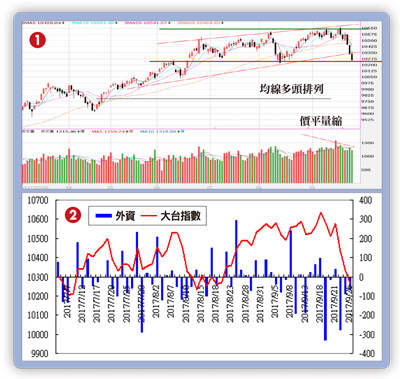 如圖一,近期加權指數變化大,上週二(九月十九日)剛到新高價附近,短短五個交易日指數已回落到一○三○○點之下,投資人關心指數是否能夠止跌?指數已經由突破前高處,也就是上升通道上緣處回落到下緣處之下,近期走勢仍是維持盤整,高點在上週歷經iPhone 8預購不如預期,市場氣氛悲觀,九月二十六日甚至來到這一波低點一○三○○之下。目前短線看回測如圖一紅線支撐價格一○二七五點附近能否止穩。再來就近期籌碼來看,外資整體為賣超,小台指散戶OI由淨空單轉為淨多單,是較為不利的一點,顯示籌碼由法人轉到較不安定的自然人,不過就這三天大跌過程中,外資的賣超力度是逐日縮減,因此這邊止穩機會將提高。綜合以上,換成合適的選擇權操作,就實際與預期來說,未來會以震盪或反彈走勢居多,操作上以平倉先前買權空頭價差為主,空頭部位在此建議先行獲利,若是空手的操作人,則建議買進買權多頭價差。