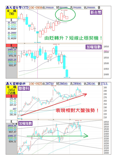 半導體相對大盤強勢新台幣匯率在九月初再次升破三十元大關時,當時留下長下影線(新台幣K線與均線關係中,空頭為升值趨勢),之後開始出現一波貶值走勢,隔幾天後大盤開始見高拉回,這就是為何筆者在當時會先建議讀者要先降低持股水位的主要原因,所以不是因為FED要縮表,也不是因為金正恩要焦土美國讓台股跌,而是新台幣走貶讓資金落跑,才造成台股這波走跌。但在九月二十五日台股再次重挫時,匯率卻出現止貶回升的現象,再加上台股成交量再次放大到一千三百億元以上,預估接下來指數有止穩的機會,蘋概股弱勢已定,結構轉換是必然,依目前筆者初步判斷,半導體產業將會是接下來台股強勢的主流族群!5G+物聯網 衝出台股新時代留意當台股下殺時,台積電(2330)只破月線,相對於台股跌破季線,表現強勢。另外,在IC設計龍頭的聯發科(2454)表現更是強勢,股價守穩在月線之上,有機會成為下一波台股的主流。聯發科的強勢主要跟未來的5G通訊以及中國的物聯網生態圈有極大的關係,聯發科已經接到思科的客製化通訊晶片訂單,對於提升毛利率有非常大的助益,再加上中國政策推動在明年就要把5G通訊普及化,擁有規格制定權的華為就是關鍵推手,以聯發科在中國與華為的合作關係,無論是在高階的5G規格以及低階高規的物聯網都能滿足其需求,未來表現值得期待!