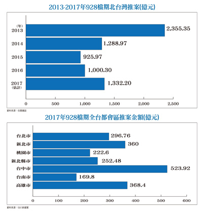 二○一七年還有兩個多月即將結束,各產業無不卯足全力拚業績,就房地產業而言,雖然寒冬還沒有走到盡頭,可是想買房的人還真不少,只是買賣雙方共識的關鍵點,還是聚焦於「價格戰」。三年來此一議題不斷發酵,除了建案比「讓利」幅度之外,再加贈車位、裝潢、家電設備,最近新北市新店區更有建案推出買屋成交送跑車麥拉倫570S方案,促銷花招令人看得眼花撩亂,真不知買房該如何議價,不是說景氣已觸底,怎麼廣告促銷還直下猛藥? 九二八檔期案量年增三成其實,如就《住展雜誌》最新調查,今年九二八檔期新案量一三三二.二億元,比去(二○一六)年增加三成,另根據數字科技旗下591新建案統計,全台都會區案量亦高達二一九三.九六億元(詳請參閱附圖),惟新案規劃大都以中小坪數為主,如就此一數據加以延伸分析,就有可能導出「北溫、中南熱」的結論,惟如再就六都一至九月買賣移轉數量合計僅十五萬五七四棟來看,答案可能就會偏於保守。另外,如再就當前實務現況加以彙整分析,當可逐漸理出一個較為完整的思緒。首先,根據高力國際公司所發表第三季商辦和土地市場交易狀況,今年前三季商用不動產交易金額僅新台幣二八五億元,比去年同期的五四一億元大幅減少二五六億元,土地交易則僅七七五億餘元,略多於去年同期的七二二億元;因此,今年土地交易將面臨九年以來千億元,商辦五百億元大關保衛戰。