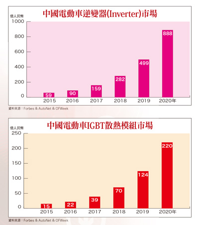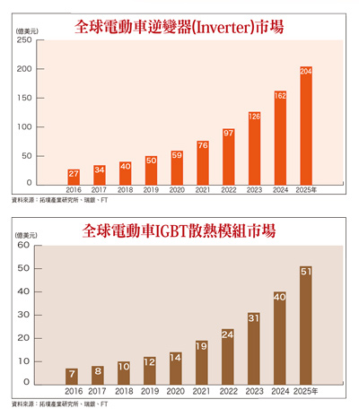 電動車市場規模穩定擴增 台廠後市營運成長可期根據知名大型市調機構-拓墣產業研究所公布市場報告指出,預估全球整體「電動車市場」將於二○二五年成長達二一五○億美元規模;同時,全球「電動車逆變器(Inverter)市場」亦將於二○二五年成長達二○四億美元;而全球「電動車IGBT散熱模組市場」,也將於二○二五年成長達五一億美元規模。另一方面,目前已是全球規模最大、年銷售量已達五○萬輛以上,整體保有量已達二五○萬輛以上電動車市場中國,其境內「電動車逆變器(Inverter)市場」,預估將於二○二○年成長達八八八億人民幣;而中國「電動車IGBT散熱模組市場」,也將於二○二○年成長達二二○億人民幣規模。