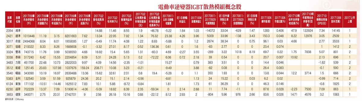 隨著中國國務院工信部於九月上旬正式宣布,未來中國境內將全面停止生產,所有以汽油、柴油為動力源燃料的汽車,以及至二○二○年底,將有多達五○○萬輛電動車上路行駛,攸關整體汽車產業發展走向重大政策後,在市場豐富想像力量的強力發揮之下,不僅因此推升了目前已為全中國規模最大「電動車」廠比亞迪(BYD,1211-HK),於香港股市掛牌的股票股價走勢,自九月八日以來,已自原本四七.二五元,持續上漲、最高一度達八一.九元,波段漲勢大幅上漲多達七三.三三%。電動車電池上游先發 原材料、零組件接棒同時,台北股市盤面「電動車電池上游原材料」相關個股如:中碳(1723)、榮炭(6555)、美琪瑪(4721)、康普(4739)、立凱-KY(5227)、長園科(8038)、聚和(6509)等,近期自九月下旬以來,亦見到七.一八%至三○%漲幅等亮眼漲勢表現。一時之間,台股電動車相關原材料、零組件、元件模組族群股,蔚為市場要角,一躍而成盤面關注焦點。其實,除了台股電動車「動力電池上游原材料」相關個股,近期自九月下旬以來,因受惠產業基本面利多題材發酵、推升效應而上演亮眼漲勢外,盤面上還有與電動車行駛過程中,電力供電量多寡、驅動能量強弱變化、行駛穩定度高低等差異情況高度相關聯之次產業族群股,如:「逆變器(Inverter)模組內建IGBT(絕緣柵雙極電晶體)」廠茂矽(2342)、富鼎(8261),「IGBT散熱模組」廠健策(3653)、艾姆勒(2241)等,短線自九月下旬以來,股價亦跟著見到明顯漲勢。
