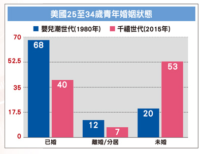 三十五年後同年未婚人口增加逾倍根據美國博林格林州立大學(Bowling Green State University)的全國家庭和婚姻研究中心(National Center for Family and Marriage Research)分析結果,在一九八○年人口普查數據顯示,當時二十五~三十四歲的人|嬰兒潮世代(baby boomers)中,有六八%的人已婚,有一二%已結過婚又離婚。但在二○一五年美國社區調查(American Community Survey)的數據卻顯示,二十五~三十四歲的人(Y世代)中僅四○%的人已婚,七%已結過婚又離婚,未婚人口整整翻了一倍多,占總人數的一半以上,可見晚婚情況十分嚴重。由於結婚的Y世代變少,加上重視自我享受,寧可把錢花在拓展生活經驗。另因Y世代在很早就背負著學貸或其他債務重擔,收入又比嬰兒潮世代減少兩成,可支配收入大幅減少。若想要購買珠寶,傾向非傳統款婚戒,選擇價格較低的紅寶石或藍寶石,甚至傾向成本較低的人工鑽石,進而拖累鑽石銷量。全球鑽石龍頭De Beers自一九四七年所打出鑽石見證永恆與誓言的廣告詞:「鑽石恆久遠,一顆永留傳(The Diamond is Forever)」,似乎也不適用在追求曾經擁有的Y世代上,以De Beers為首的鑽石業者首當其衝,正面臨銷售萎縮的危機。人口移動比例降低 房市需求的隱憂結婚及生育是影響人口移動的兩大因素,但Y世代比上一代更晚婚,生育年齡延後或甚至不生,導致Y世代移動的比例比過去更低。美國皮尤研究所(Pew Research Center) 調查顯示,美國Y世代是幾十年來最沒有自由能力的一代,在二○一六年二十五~三十五歲的人中,只有二○%表示前一年換了居住地址,二○○○年時的調查比例為二六%,一九九○年時的調查比例則有二七%,顯示年輕人的移動比例逐漸降低。年輕人被困在原地的部分原因是沒有能力買房,或是根本沒有興趣買房,只有六%的Y世代表示二○一六年搬家是因為買房,二○○○年時調查比例為一四%。年輕人低自有住房率則成為住房市場復甦中最大的阻礙之一,根據美國人口普查數據,二○一六年第四季三十五歲或三十五歲以下為戶主的家庭,房屋自擁率下降到三四.七%,低於二○一○年第四季的三九.二%。晚婚現象伴隨而來的晚婚不生(少生)、不婚不生的問題,更逐漸變成國家層級的問題,少子化勢將衝擊到社會及經濟面的發展。經濟成長的關鍵在於生產力,若十五~六十四歲的工作年齡人口減少,勞參率又沒提升,很可能導向勞動力短缺的結果,將限縮經濟成長動能及國家競爭力。目前已見到台灣的學校、大學學生數量驟減,部分大學正面臨退場的抉擇,以及人口結構逐漸高齡化。王道銀行、力山站在趨勢浪頭上回到投資面,由於Y世代重視自我、晚婚及可支配所得減少,連帶消費行為偏好也跟著改變,也將牽動各產業未來興衰的變化,像是過去本刊持續追蹤探討的單身經濟、寂寞商機、銀髮商機及利基型客製化市場,將隨Y世代逐漸成為消費市場主力而走向長多。曾經歷金融海嘯的Y世代不信任金融機構,已很少前往實體銀行(擁有銀行帳戶的年輕人,每月造訪銀行次數僅一次或不到一次的比率將近七五%),電子化比重高的金融機構未來營運展望將優於實體分行據點高的同業,例如國內首家原生數位銀行的王道銀行(2897)。Y世代認為高爾夫球是上一代的玩意兒,轉為青睞飛輪健身等運動,帶動飛輪器材需求大增,像是銷售智慧家用飛輪及健身線上課程的Peloton,今年六月獲得三.二五億美元的E輪融資(投資者包括Wellington Management、富達投資及KPCB等),市場認為其將為健身產業帶來很大的衝擊。國內電動工具機廠力山(1515)則是Peloton的飛輪代工廠之一,隨著產品於今年第三季起正式出貨,營運動能正逐步加溫中。