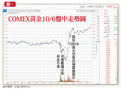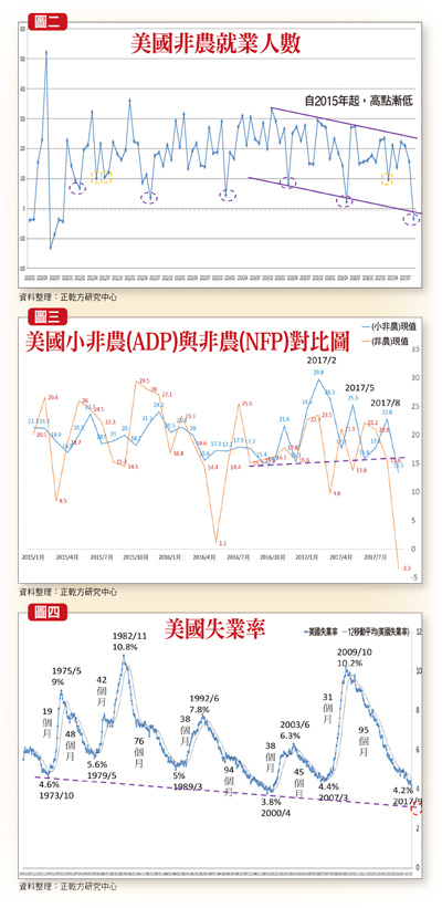 從二○○八年金融海嘯之後,美國非農就業人數大致以新增十萬人為底線,就算偶有跌破,也會馬上反彈,因此九月非農就業數據意外下降到負三.三萬人,預期十月非農就業數據將會出現反彈。這也是十月六日COMEX黃金先跌後漲的關鍵之一(圖一),因為市場預期十月非農數據應該不會再惡化。美國九月非農就業數據解讀從圖二可見,美國非農就業人數自二○一五年開始高點漸低,而美聯儲正式升息時間點正好落在二○一五年十二月,這是否暗示隨著美國聯邦利率的上升,美國非農就業人數會持續下滑,如果這假設成立,那麼隨著美聯儲已經公開承認低通膨可能是個常態,而美聯儲升息動作將不受低通膨影響,因此在九月二十日FOMC會議之後,市場普遍認為年底前升息二十五個基點是大概率事件,那麼,隨著美聯儲既升息又啟動縮表的緊縮貨幣政策下,如果明(二○一八)年川普一兆美元基礎建設財政方案沒有得到國會支持而推動或延遲的話,那麼美國非農就業人數的復甦力道可能逐漸轉弱,值得追蹤。值得一提的是,在九月非農數據公布利多金銀的情況下,COMEX黃金演出利多反跌的戲碼,數據公布後下跌到一二六二.八美元,跌八.三美元,主要原因是市場忽略新增負三.三萬人意外數據,而聚焦在九月平均每小時工資增長超過預期─環比○.五%(預期○.三%),同比二.九%(預期二.五%),市場認為這數據將強化美聯儲升息的立場。儘管這可能僅是受到二次颶風災害所造成的短期勞動力短缺的影響,但數據公布