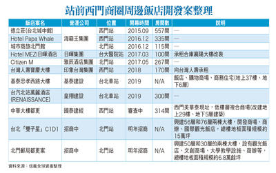 陸客來台人數驟降 觀光業慘屋比趨勢研究中心總監陳傑鳴表示,雖然今年陸客仍有一兩百萬人次來台,但衰退比例卻是有目共睹,受衝擊的觀光業可說是「慘不忍睹」。不過,對比全台其他地區的慘況,台北市站前及西門商圈的飯店熱卻絲毫未減,信義全球資產代理一部經理康錫晃指出,陸客來台人數縮減後,飯店業多受衝擊,但站前西門商圈卻逆勢發燙,成為住房率保證。他談到,台北西區具台北車站、機場捷運交通優勢,再受惠西門町觀光人潮洶湧、西區門戶計畫加持,旅客幾乎都必至西門町一訪,使得站前西門商圈成為台北最熱門的指標商圈,台北西區翻轉,吸引企業插旗商用不動產,共有三波旅館開發潮前仆後繼。他說,第一波商旅開發潮是從二○○七年福華飯店體系的福泰桔子商旅率先開跑,而晶華集團的捷絲旅於二○○九年接棒、國賓集團AMBA Hotel於二○一二年搶進西門町,另外,原先的錢櫃中華舊館也改裝為永安棧等,算是帶動舊商辦大樓改建商旅的風潮。第二波飯店進駐潮則是海霸王集團在二○一五年改裝閒置已久的新生報業大樓,推出德立莊飯店,而今年則有日暉集團Hotel MEZI和雅辰集團Citizen M酒店開幕。第三波飯店進駐潮,則以建設公司及政府公辦投資案為主,多屬新建大樓複合旅館、商場、商辦使用,首先是可望在二○一九年啟用的基泰忠孝西路案,部分樓層將規劃做旅館使用。皇翔建設將在京站對面的台汽北站興建,由萬豪集團旗下品牌的萬麗酒店(RENAISSANCE)經營,預估二○一九年第三季開幕(見附表)。西區翻轉 商旅不受影響康錫晃表示,隨著能改裝商旅的大樓減少,第三波飯店投資潮,將以都更或新建案為主,除了新飯店開發帶動區域發展,還有微風商場確定進駐機場捷運A1站,另外台北雙子星、北門郵局都更案等,也將再新增複合旅館、商場、商辦的大樓,一改站前西門商圈皆是老舊建物的形象。他說,陸客來台人數雖減少,但來自香港、日本及韓國,以及東南亞的自由行觀光客也有所增加,在觀光人潮支撐,又有西區門戶計畫開發支持,再加上無可取代的交通優勢,新商業大樓完工使用後,站前及西門商圈整體商業強度再提升,將坐穩最強街邊型商圈寶座。