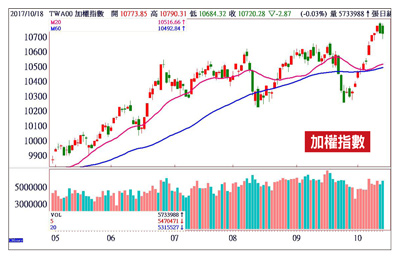 台股加權指數如我們在十月初周刊專欄所言,至少有機會往上漲到十月十九日台積電(2330)法說前後,而這一波指數也主要在台積電大漲的帶動下, 在十月十七日看到一○七九八點今年新高。因此針對台股後市看法仍不變,一來持續創高的美股道瓊指數,與年線正乖離已經來到一○%以上,加上準備進入超級財報周,會不會像八月初的美股一樣,未來反而須隨時提防財報利多出盡,以及與年線乖離過大的修正拉回。控制持股比率 提防利多出盡漲多拉回台股亦同,在台積電法說會前後至十月底、十一月初這段期間,當第三季財報以及十月營收反應近尾聲之後,要提防利多出盡做漲多拉回,加權指數應該至少再回測季線至半年線再上。假設美股回檔得比較深,或是iPhone X出貨不順影響蘋概股十一月營收的話,台股大盤深則回測年線上下再上來。尤其短期因為這一波指數漲幅比預期來得大,來到一○八○○至一一○○○點,反而不是好事,因為接下來可能要面臨的是不同級數的修正波!所以請大家務必控制好持股比率,慎選低基期獲利成長股來操作,以及善設停損停利點。