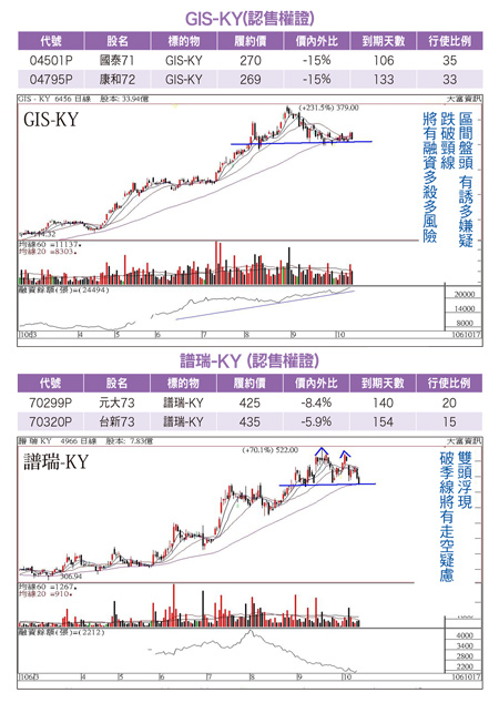 有持股買認售權證 空頭避險 空手者買認購權證 多頭避險面對現階段指數走高但個股未必跟著續強,投資人該如何擬定操作策略呢?此時權證就可以幫助各位利用小小的資金來達到避險的效果,但投資人須了解目前手中持股與資金部位,利用權證進行多頭或空頭的避險策略。多頭避險與空頭避險這兩個名詞與期貨的避險操作有關,不過資金較少的投資朋友可以善用這樣的概念,利用權證來達到獲利增加或減少損失的操作。通常股票操作面臨的是價格風險,價格風險可分為價格上漲的風險或價格下跌的風險。台股融資創新高,可見散戶該進場的差不多都進場了,手中已持有股票者所擔心的是價格下跌帶來的風險,因此可以在市場建立空頭部位(買進相關持股的認售權證),若是手中持股出現下跌有所損失時,可利用買進相關認售權證,達到保護下跌股票的損失,這種買進認售權證的操作方式屬於空頭避險。若是投資朋友手中沒有現貨(股票),由於擔心股票價格上揚,所以在市場建立多頭部位(買進個股的認購權證),稱為多頭避險。因此針對手中是否持有股票的部位不同,將使投資人在市場採取不同方向的避險部位。由於市場融資大增,很多投資朋友擔心股票買在高點怎麼辦?本期建議可以利用買進認售權證的方式,為手中持股買保險,減少損失,針對股價高檔且融資高的個股介紹認售權證,讓投資朋友了解權證不只是可以小搏大,也是可以達到保護持股的最佳工具。