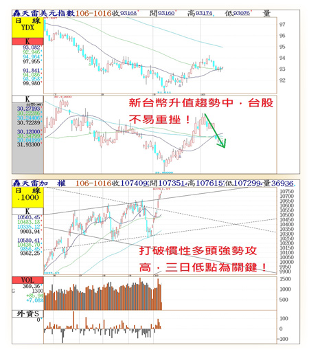 放空莫明 逆勢操作難近期台股又開始出現放空的言論,深究其放空的原因不外是台股沒有基本面、不值得站上萬點那麼久,甚至也有利用天干地支的易經推算每幾年是個大週期循環,而台股近期已經進入了其循環週期中的下跌時間,這也是為什麼台股的融券餘額大部分時間都維持在五十萬張以上的主要原因。在讀者看到這些言論的同時,要回頭冷靜地思考,這些言論都沒有明確地點出真正下跌的時間,不管投資朋友何時接觸到這些言論,只要因為被嚇到而進場放空,短線上在台股強勢的環境中很難討到便宜,但卻要付出昂貴的時間成本,甚至是被軋空的損失!台股創紀錄已非池中物在筆者的看法,這波台股直衝一○七○○點以上,已經打破台股過高馬上壓回的慣性,要注意的關鍵只有兩個:(1)新台幣匯率何時由升轉貶?(2)台股何時不再創高?在沒有出現這兩個條件之前,短多就是順勢而為。因為台股從站上萬點以來已經超過百天,創下二十七年半以來的新高不在話下,除此之外,股王大立光也創下台股史上股價新高的天價六○七五元,權王台積電也創下台股市值新高紀錄,這些紀錄早就已經說明台股已進入到過去經驗都無法判斷的階段,讀者還在用過去萬點是高點的統計結果做判斷嗎?還在用主觀意識去摸台股的頭嗎?用過去統計結果或是經驗來操作台股的結果,不是被軋空手就是被軋空單,放下成見,多頭格局未見轉變之前,選擇好股順勢操作才是王道!