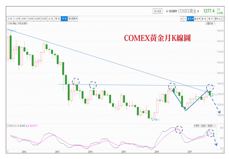 美元指數走強 不利COMEX黃金結果十月二十日的美元指數早盤走強(參議院通過二○一八年預算),就正好在20MA支撐之上拉出陽線,顯然這波從九一.○一低點反彈以來的走勢還沒結束,下一階段可能挑戰120MA的九四.七點壓力,如此一來相對不利COMEX黃金。美元指數的相對強勢,造成了人民幣近期的走貶,從十月十一日的六.五五七七元兌一美元到十月二十三日的六.六三七八元兌一美元,走貶的人民幣,有利黃金TD上漲,不利黃金下跌。但COMEX黃金從十月十六日遇到九月二十日的一三一九.八美元高點連接九月二十六日的一三一七.一美元高點的壓力線之後,單周下跌二二.八美元(跌幅一.七五%),構成轉折向下的K線組合,十月二十三日續跌,不排除拉回測試六十周均線的一二五一美元支撐或是一二○周均線的一二二四美元支撐。對應到黃金TD而言,由於20MA本周將死叉120MA在二七六.五元附近,意味著250MA支撐將失守,不排除波段下方的低位支撐要下移到二七一元附近。黃金TD預估十一月至明年一月先跌再漲相對落後COMEX黃金的黃金TD,20MA還沒突破仍然是壓力,但60MA也不是很強的支撐,所以短期處在二七五至二七八元之間做震盪。從二○一六年六月英國退出歐盟以來,整個黃金TD的走勢呈現三角形壓縮的格局─高點漸低、低點漸高的走勢,對應美元指數的走勢,預期在未來三個月黃金TD的走勢:十一月至十二月中旬下跌,十二月至明年一月中旬上漲,一月底之後因美聯儲強化加速升息的預期,跌破三角形整理型態,回補二四三.九八至二五三.一元的多方缺口。