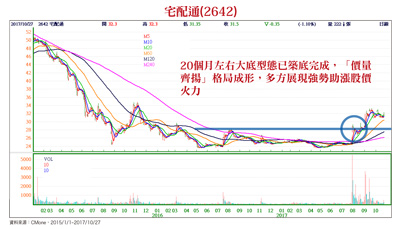 成為阿里巴巴物流供應鏈 台驊今年營收雙位數成長惟全球今年經濟成長表現料將仍可優於去年水準,加以航商為達營運獲利目標,將持續控穩運力供給量、運價區間平衡。同時,進入第三季後,整體航商聯盟將於海運淡季進行運能供給面調節、管控,後市海運運價可望獲有效支撐。空運市場部份,台驊表示,受惠中國十一長假、歐美市場消費購物需求,歐美長程線九月份空運艙位十分吃緊,航空貨運公司自九月下旬開始,即已相繼大幅調漲運價,台驊所承攬空運運貨量亦見明顯成長。展望第四季營運,由於東西方節慶消費購物貨運需求大增,可能順利帶動航空物流業成長規模。除中國雙十一購物節電商購物狂潮,已年年創高消費紀錄外,加上後續歐美市場消費旺季亦將到來,伴隨消費性電子市場主流新品將陸續上市,亦將明顯帶動包括:面板廠、半導體設備廠、記憶體廠、被動元件廠等上游相關零組件貨運需求持續增加。物流市場部分,受惠中國十一長假、雙十一購物節點火消費購物需求,且中國內需消費市場規模正不斷擴增,料將持續帶動台驊相關進口報關、倉儲、貨運、配送業務量隨之成長。法人機構預估,台驊明年營收年增率約八.六七%,全年營收約一一○億元,EPS約二.五五元。自動理貨系統運作正常 宅配通發貨量倍數成長宅配事業(營收占比七八.二○%)、物流(營收占比二○.二一%)專業廠宅配通(2642),今年第二季營收七.一八億元,稅後淨利四五七三萬元,EPS○.四八元。上半年營收達一四.二八億元,稅後淨利九五五七萬元,EPS一元。上半年營收年增率達一○%以上,成本降幅約二~三%,有助營運獲利成長,毛利率約一八%~二○%。宅配通於桃園地區所建構「全新桃園轉運中心」,以及全新大園物流中心,合計共多達一萬坪,物流、轉運空間已陸續啟用。對於今年八月上旬時,因自動理貨系統出現作業異常,因此延誤往來客戶貨品物流配送問題,宅配通指出,自動理貨系統共計為兩套,目前低速自動理貨部分,作業正常;高速自動理貨部分,亦已完成相關調整作業,九月底已全面正常化運作。宅配通二○一二年到二○一六年營收複合平均年增率僅○.四八%,今年上半年則交出一成以上成長率亮眼佳績。主要與公司過去著重電視購物相關物流配送服務,去年則開始強化電商物流業務,提供貨主當日送達客戶手中服務。另外,宅配通成立十七年以來,今年首度調高物流服務牌價,每件宅配費用(營收)平均提高約八~九元,亦有助提升營收業績。宅配通財務長指出,發展電商業務之後,淡旺季差異表現因此變得不明顯。同時,由於電商物流服務發貨量,自今年三月份開始已逐步擴增,阿里巴巴旗下「淘寶網」交付予宅配通發貨量持續增加。宅配通也已進一步於北京租設倉儲中心,以擴充物流服務能量。淘寶網已成宅配通大客戶 營收業績未來將穩步攀高淘寶網目前已成為公司主要大客戶之一,七月營收因此順利創下高成長佳績;八月份營收表現,儘管因自動理貨系統發生辨識問題,因而影響部份發貨量。惟與去年同期相比,仍交出高成長佳績,九月份亦持續衝高,續創單月營收歷史新高記錄。預料「雙十一購物節」將帶動淘寶網大量貨物運輸、物流配送需求。由於今年電商物流整體發貨量可望持續穩健成長,加以第四季位於桃園的轉運中心亦將上線營運,有望帶動宅配通單日處理發貨量倍數成長,宅配通樂觀看待營運後市。圖表一