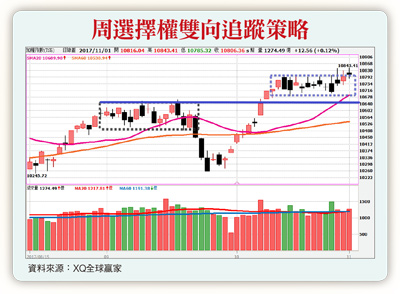 摩根史坦利的財報透露,該公司的客戶,不論是散戶還是法人的現金水平都已來到歷史低位,如果聯準會要繼續收銀根,那麼錢已用盡的投資人該如何繼續買股票。因此,稅改細節與聯準會之後的政策方向,能否為市場帶來更多的流動性,是美股能否持續上漲的關鍵。根據主計處新公布的第三季經濟成長率,估值為三.一一%,創下連續十季以來新高。其中出口表現特別強勁,國際市場的需求強勁,帶動台灣的出口,第三季出口金額高達八三八億美元,規模創下歷史新高。經濟數據表現亮眼,台灣加權指數也跟隨國際市場的步伐,最高來到一○八四三點。iPhone X的預售成績亮眼,讓投資人對台股後市有所期待,不過台灣的蘋果供應鏈,股價在接到蘋果訂單時已先行反映,預售情況很難直接影響台股。能夠再推升蘋概股的契機,便是第一批貨的銷量狀況,以及市場對後續追加訂單的預期。台股近期多次站上一○八○○點,不過受到高檔賣壓影響,指數一直來回整理。從籌碼觀察,外資期貨未平倉部位,十一月一日的淨多單下降到五萬多口,淨多單水位再次降到近期相對低檔。同日自營商在選擇權的未平倉,Buy Call持續下降來到八千多口,Sell Put則是從六萬多口來到八萬八千多口。而新台幣匯率近期再度回升到三○.一七的水準,顯然資金並沒有放棄台股的打算。整體來看籌碼不積極作多,但也沒打算放空,台股後市預期繼續偏多震盪。我們可以用溫漲作莊(賣權多頭價差)策略來布局。