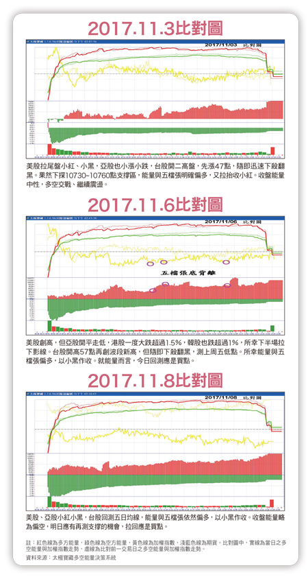 上周三(十一月一日)台股小幅創高後,又震盪拉回。我在FB有明確預告:台股加權指數支撐區已提高到一○七三○至一○七六○點,有回測此處都是買點。隨時會再創高。上周四(十一月二日)小跌十七點。上周五(十一月三日)美股拉尾盤小紅、小黑,亞股也小漲小跌,台股開二高盤,先漲四十七點,隨即迅速下殺翻黑。果然下探一○七三○至一○七六○點支撐區,現貨到一○七六五點,期貨到一○七四七點,能量與五檔張明確偏多,又拉抬收小紅。收盤能量中性,多空交戰、繼續震盪。上周五美股創高,但本周一(十一月六日)亞股開平走低,港股一度大跌超過一.五%,韓股也跌超過一%,所幸下半場拉長下影線,收小黑。台股開高五十七點再創波段新高,但隨即下殺翻黑,再測一○七三○至一○七六○點支撐區。所幸能量與五檔張明確偏多,留下影線以小黑作收。就能量而言,回測應是買點。周二(十一月七日)美股小紅創高,亞股漲跌互見,台股開一高過高盤,能量與五檔張依然偏多,以小中紅近高點作收。收盤能量中性偏空,還有再次回測的機會。周三(十一月八日)美股、亞股小紅小黑,台股回測五日均線,能量與五檔張依然偏多,以小黑作收。收盤能量略為偏空,九日應有再測一○七三○至一○七六○點支撐的機會,拉回仍是買點。