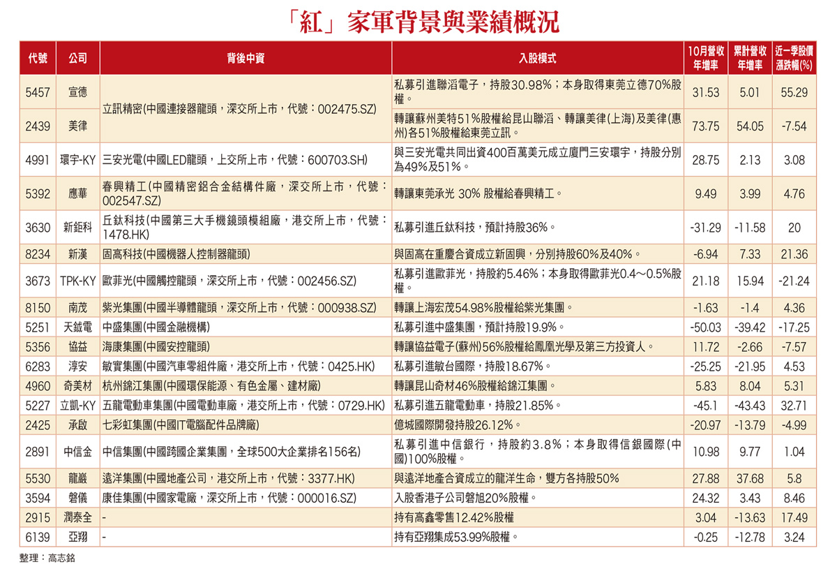 近日美國總統川普訪問中國期間,為解決兩國巨額貿易逆差問題,送上「刷新世界經貿合作史上新紀錄」的經貿大禮,雙方共同簽署十五份商業合作協議,總金額高達二五三五億美元,正足以顯現經濟實力的霸氣。不僅如此,中國政府近來也在各重點產業積極拉高本土化自製率,並強力扶植大怪獸,企圖成為規格制定者,主導未來世界的發展趨勢。中國盟友火力支援 紅家軍逐步拉開差距由此可知,沒有擁有強大出海口且快被邊緣化的台廠,若無法跟中國廠搭上線,坐上產業成長列車,未來營運恐將遇上不小的阻力。相對的,就如理財周刊八八三期封面故事曾提過,部份尚存技術價值的廠商,選擇帶槍投靠中國成為「紅」家軍,較有機會延續營運周期,甚至再創高峰。這些紅家軍在中國廠的火力支援下,不僅營運已逐步與同業拉開差距,也成為盤面資金較偏好的族群,自然股價也會有較亮眼的表現。台廠與中國廠的合作方式大致可分為二種,第一種為直接辦理私募引進陸資,變身為中國廠在台的子公司,像是宣德(5457)、新鉅科(3630)、TPK-KY(3673)、淳安(6283)、立凱-KY(5227)等。第二種是在中國合資成立子公司(或入股台廠在中國的子公司),徹底落實本土化,像是中壽(2823)、美律(2439)、環宇-KY(4991)、應華(5392)、新漢(8234)、南茂(8150)、奇美材(4960)、龍巖(5530)及磐儀(3594)等。