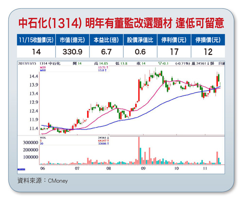如之前專欄筆者所言,在十一月初至十一月中必須留意美股和台股第三季財報利多出盡拉回整理,加權指數果然在十一月九日中長黑跌破月線進入整理。後續則要觀察在第三季財報完全公布之後,財報不確定因素消除,以及十一月台指期結算過後,留意是否出現短線轉折,否則就得提防大盤回測季線至半年線(一○四五○~一○六二○點)。這一波的短線回檔修正,最主要就是個股位階的調整,所以挑選低基期第四季和明年的獲利成長股,風險相對有限,後市也比較有表現空間。中石化(1314)第二季因為處分轉投資志氯公司等業外收益,使得今年上半年EPS為一.八五元,前三季EPS為二.一一元。AN(丙烯腈)和CPL(己內醯胺)目前市場供給皆偏緊,針對CPL部分,九月CPL中國廠有減產情形,以及新產能開出不如預期,加上十月和十一月適逢歲修潮,中石化表示,預期供給偏緊狀況將可持續,十二月價格則視中國北方霧霾是否嚴重,若霧霾嚴重,可能會影響中國北方工廠面臨停產命運,如此將有助於價格持續穩定,供給持續偏緊。AN近期價格則受惠美國哈維颶風影響,現貨價來到近兩年新高,預期遠洋貨要在十二月底至明年一月才能到達亞洲,在此之前價格亦可望獲得支撐。預估中石化第四季本業仍可望獲利,全年預估每股可賺二.三至二.五元。加上每股淨值高達二三.五二元,而且明年即將董監改選,具有董監改選題材。