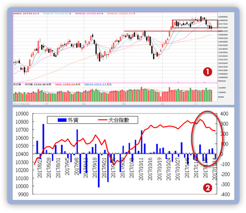 這段期間如圖一,行情就在高檔一○七○○至一○八○○點間盤整,然而就在十一月十日開始展開了修正行情,指數屢屢向下,嚇得投資人覺得行情已經反轉,但投資朋友可以不用擔心,在十一月十四日這天加權指數最低就在一○六五四點,仍是未破一○六五○點,因此維持先前看法,只要行情未破一○六五○點之前仍是偏多看待。再就近期溫拿與魯蛇籌碼來看,如圖二外資在期貨與現貨合計,是站在調節方,指數向下過程中外資有買有賣,但總合來說買賣超不大,可見這波修正主要仍是內資中小型股為主。魯蛇籌碼方面,小台指散戶OI則是減碼空單,溫拿小賣,魯蛇也無太多動作,修正行情即將完畢,指數有望再度回到先前趨勢。綜合以上,換成合適的選擇權的操作,就技術面與籌碼狀態來看,操作建議可轉為溫和偏多,增加THETA值部位,在止穩過程中即使行情未有大幅上漲或甚至小跌,都仍享有時間價值的好處。建議操作十二月選擇權賣權多頭價差。