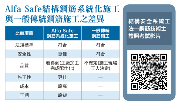 「Alfa Safe鋼筋系統化工法」的優點在於能將鋼筋在工廠生產成組件化的配件,工人只需在工地做最簡單的組裝即可,這樣不但施工更快速、品質更穩定、耐震強度再提升,更能確保建造的房屋更安全穩固,並以「系統化system」、「簡單化simple」、「效率化 speed」、「標準化standard」,朗朗上口的「4S」作為縮語,使其基本精神能常駐人心。因此推動鋼筋系統化的設計流程,即是要將結構鋼筋設計與可執行的施工方式相互比對並確認,使結構設計者與施工人員對施工品質的標準達成共識,建造出符合規範且耐震安全的房屋,甚至能從開始規劃建構房屋,就將專業的結構力與防裂、防漏水的規劃設計、鋼筋彎折加工研究及現場施工技術相互整合,以達到工期短、品質佳及成本合理的目標。推動「系統工法鋼筋技術士」證照受訓與考試