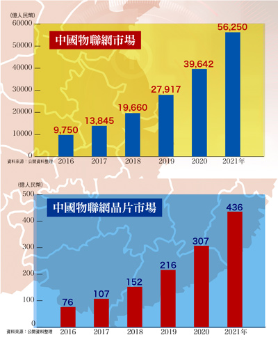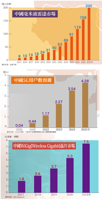 另外,半導體產業方面,為有效彌補每年金額龐大,動輒高達一六○○億美元以上的半導體產品進口逆差,中國官方透過成立規模龐大發展基金方式,多年來,不僅已成功促成半導體上游IC設計產業蓬勃發展,成功搶進全球IC設計業,市占率、產值排名前十名內,中國IC封測廠亦已成功搶下全球市占率排名第三大廠佳績。同時,為全球薄型面板產業界人士所共同認可為下一代顯示面板霸主OLED(有機電激發光二極體)面板,中國自主面板大廠京東方、華星光電等,目前也正在加緊研發、量產腳步,希望最快可以提前於二○一九年,成功大規模量產OLED面板,搶下韓廠供應鏈專屬優勢,加入供貨給全球消費性電子產品巨擘-蘋果(Apple)供應鏈行列,不僅可因此與現為全球OLED面板巨擘韓廠-三星、LG一較高下外,同時亦可有效滿足中國境內市場需求,徹底落實OLED面板在地自製化、自主獨立供應、自給自足產業發展政策目標。中國半導體產業大躍進 IC設計與封測全球市占升根據多家包含:CCS Insight、ABI Research、安智汽車等市場研調機構、產業廠商所做市調報告資料指出,中國物聯網、5G通訊、毫米波雷達、WiGig(Wireless Gigabit)等,半導體IC晶片、模組元件下游應用市場,產值、用戶數等重要市場規模衡量指標,預計將分別於二○二一年、二○二五年、二○二七年、二○二一年,成長達五六二五○億元人民幣、四.二八億用戶數、二○○億元人民幣、七.五億顆晶片。中國半導體產業相關上下游廠商,不僅成功搶進全球IC設計業市占率、產值排名前十名行列,IC封測廠亦已成功搶下全球市占率排名第三,持續提升半導體應用晶片、模組元件之「獨立自主製造」能力及「在地化生產」供貨比率,中國官方更進一步規劃重點扶持包含物聯網、5G通訊、毫米波雷達、WiGig(Wireless Gigabit)等未來市場產值