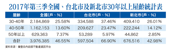 Q:都更推動多年績效不彰,政府再出招,日前內政部發文修正都市更新條例,推出四道防線,分別為透過增加都市計畫審議、舉行聽證、強化都更審議及協商平台等四道防線,期望經由連結都市計畫及修訂法令,以加速推動都更。營建署強調,此次修法期望可以強化都更之程序正義,透過制度的設計以確保不同意戶表達意見的機會,看似可以為現行機制再做補強,不過,實質效益如何,恐還有待觀察。此外,內政部還自行設定目標,擬藉由「都市危險及老舊建築物加速重建條例」,每年審議通過五百案、約一萬戶,當中台北市及新北市各一百案,其他四都各五十案,其他縣市合計約一百案。對於政府提出的四道防線及預期效益,可否達成加速都更政策目標?請教莊教授的意見。A:過去十年,據統計二○○六至二○一六年間所通過核定的都更案僅四四九案,平均每年約四十案、二千戶,有鑑於建物老化數量愈來愈多,內政部遂積極推動修法,以期加速都更腳步。不過,就事論事,都更是實戰不是紙上談兵,並非擬定理想化的數字及法令條文就能輕易達成,就釘子戶代拆問題,光是從事業概要到權利變換過程就必須克服相當多有關法令、人性及利益上的問題。以三九七萬戶推估產值 不切實際根據數據顯示,截至二○一七年第三季,全國、台北市及新北市屋齡三十年以上分別為四六.五五%、六六.九%及四二.九八%,其中又以三十至四十年所占比例最高,分別為二五.五八%、三七.四六%及二六.○一%,從以上數據不難瞭解,台灣的屋齡已普遍偏高,一旦發生地震災害,結構安全必定面臨嚴格檢驗,其中又以九二一地震前所興建耐震係數偏低最受關注,因此,加速推動都更,勢在必行。另外,內政部一直以全國超過三十年屋齡三九七.六四萬戶作為推算產值依據,顯有不切實際之虞,其因在於除台北市與新北市房價較高,較具都更價值,亦即僅一二七.四萬戶較具推動可能性(詳請參閱附表);至於逕以自行設定數據推算,則未免過於樂觀。