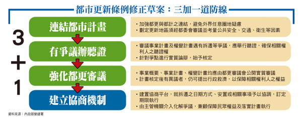 第一道防線:連結都市計畫—加強都更與都計之連結,避免外界任意圈地疑慮—劃定更新地區須經都委會審議並考量公共安全、交通、衛生等因素這一道防線旨在加強都更與都市計畫之連結,以免與都市計畫衝突而招致批評,其中又以是否有妨害公共安全、公共交通、公共衛生等之疑慮,或確有都更的必要性等議題最受關注,以避免外界對於都更有任意圈地的疑慮。惟就都更審議委員會之實務經驗,通常都會先就整個街廓列入更新考量,而要求實施者再試行整合,以免棄小面積基地於不顧而招致批評,未必是實施者刻意圈地所致。因此,有關此一議題與都市計畫連結之實質意義較大,對於任意圈地的疑慮還是回到原點。第二道防線:有爭議辦聽證—審議事業計畫及權變計畫遇有拆遷等爭議,應舉行聽證,確保相關權利人之聽證權—針對爭點進行實質論辯,始予核定針對增加都市計畫審議這一關卡,勢必又得增加審議時間,而政府又期望每年通過五百案,光是都市計畫審議與都市更新審議委員會審查過程,對於有爭議就必須舉辦聽證會這一項,如果舉辦聽證流於形式,對於不同意戶所提出的問題無法達成共識,開再多次的聽證會也可能留存爭議紀錄後又回到原點。以鄰近捷運圓山站的明倫國小公辦都更案為例,也是依規定舉辦至少兩場聽證會,結果是聽證會舉辦了,卻沒有理出一個獲得共識的「結論」,只留下一些爭議性會議紀錄而已,聽證會中即便有居民表達不同意意見,北市府還是執意開工興建。由此可知,舉辦聽證會的實質效益不大,因此,對於聽證會是否應該規定次數或取得某種程度的共識等問題,仍舊是阻礙都更之一大爭議點。就明倫國小都更案引發民眾反彈議題,會後當地居民的結論依舊認為根本只是政策「布達」,沒有討論溝通哪來結論。第三道防線:強化都更審議