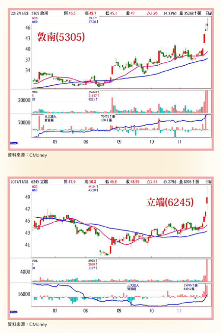 敦南分離式元件營收穩定擴增敦南(5305):公告十月營收一○.五四億元,月減五.一五%,年增一八.六○%;一至十月累計合併營收九四.七一億元,年增八.四三%。敦南光電元件影像感測器部分占整體營收約一○%,分離式元件占約五○%。IC產品營收占比約三七%,主要由轉投資昂寶-KY(4947)貢獻。非昂寶貢獻營收部分占比仍低,近幾年處虧損狀態,唯目前已有新產品送客戶認證中,預估明年有機會出貨放量。晶圓代工營收占比約三%。敦南為擴大營運動能,近年來成功切入票務機利基市場,九月營收達一一.一一億元創歷史新高,主要受惠中國長假前客戶提前拉貨效應,第三季合併營收達三二.三一億元,季增一一.四五%,年增一五.二八%。法人表示,第四季為敦南傳統營運淡季,營收預估可能季減五%至一○%。唯就全年營收表現而言,法人表示,今年受惠分離式元件出貨順利切入手機快速充電應用市場,打入中國前十大手機廠,在手客戶數從去年兩個增加至今年四個,加以PC應用產品線受惠電競PC需求成長帶動,出貨持續增溫,預估敦南分離式元件今年營收有望穩定擴增。法人機構預估敦南明年營收可達一二三.八三億元左右,年增率約八.二%,EPS約二.七一元。立端受惠網路安全設備拉貨需求立端(6245):網路通訊設備(NC,營收占比七三.七九%),其他、原材料及其他商品買賣(一九.五九%)、智能聯網電腦(AC,營收占比六.六二%)專業廠,公告十月營收六.二二億元,月減一一.七九%,年增五七.二七%;一至十月累計合併營收五一.七六億元,年增七.六一%。立端公告前三季累計營收四五.五七億元,營業毛利一二.四一億元,毛利率二七.二三%;營業淨利三.一一億元,營益率六.八三%;稅前盈餘三.○三億元,本期淨利二.四一億元,合併稅後盈餘二.一四億元,年減一三.七二%,EPS二.○五元。立端於資訊安全產品研發成功累積市場競爭優勢,客戶包含主要全球知名網路安全設備廠,如A10 Networks、Check Point、L&S、Watch Guard等。電信服務商為搶回網路應用服務主導地位,重視電信領域網路安全防護、防駭布局、建設,也將進一步提升對網路安全相關設備拉貨需求,料將成為立端營運商機重要來源。