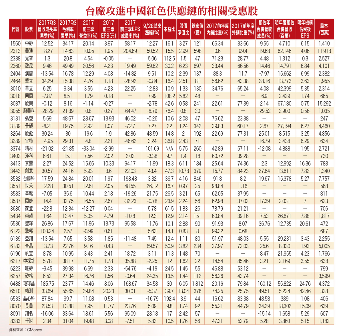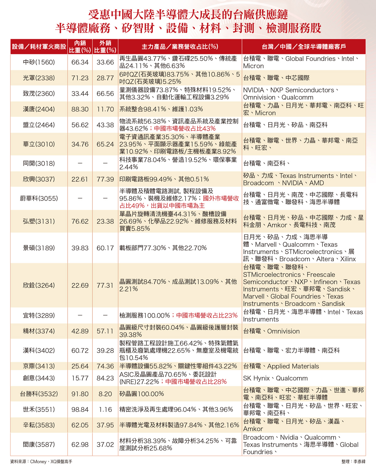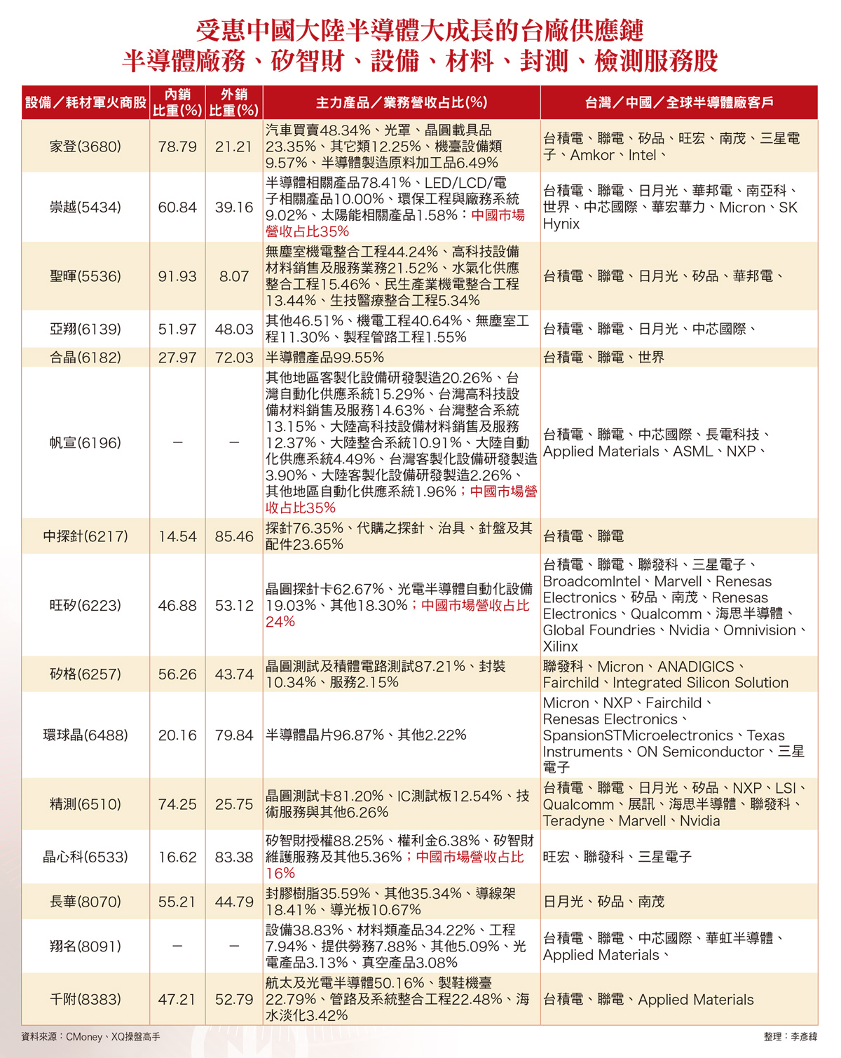 晶心科 盟立 亞翔 京鼎 閎康 中國半導體自主化最大受惠股中國大陸半導體產業自主發展豐碩、已成為全球半導體產業成長最多的地區,可望受惠的台廠供應鏈包括矽智財(IP)、無塵室興建、裸晶圓與再生晶圓片、晶圓研磨、光罩顯影與蝕刻、濕製程與晶圓傳載、磊晶沈積、離子佈植、晶圓(片)測試與封裝等半導體設備/材料廠等,如:智原(3035)、創意(3443)、力旺(3529)、世芯-KY(3661)、晶心科(6533)、漢唐(2404)、盟立(2464)、聖暉(5536)、亞翔(6139)、京鼎(3413)、環球晶(6488)、台勝科(3532)、中砂(1560)、帆宣(6196)、弘塑(3131)、辛耘(3583)、家登(3680)、翔名(8091)、世禾(3551)、精材(3374)、中探針(6217)、旺矽(6223)、精測(6510)、宜特(3289)、閎康(3587)、長華(8070)等,後續長期營收獲利表現,亦不排除有機會直接、間接,供貨予中國大陸多家中資、中外合資、外資獨資半導體廠而受惠,帶來源源不斷的業績成長動能。圖表一圖表二圖表三