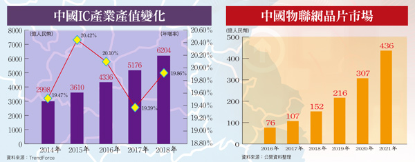 知名產業市調機構-IC Insights,將全球IC市場產值今年成長率預估值,提高達二二%,半導體業景氣有望持續熱絡。同時,半導體產業協會-SIA指出,全球半導體銷售金額今年第三季為止,已達一○七九億美元,今年全球半導體銷售總額有機會創下新高紀錄。唯中國IC晶片需求量目前已占全球五○%比重,部分類型晶片甚至占比達七○%~八○%以上,中國自主品牌IC晶片自給率,卻僅有八%左右。作為半導體產品應用最主要核心部件的IC晶片,對中國國家戰略規劃具重要意涵,料將成為「十三五」規劃全力攻堅重點項目。IC Insights指出,中國國產、自製半導體晶片,未來自主研發、設計、封測各分項領域,長期發展潛力雄厚。伴隨中國半導體產業持續拉高自製率同時,所隨之帶動相關「廠務、機台設備、材料、IP矽智財、精密洗淨及再生、檢測、封裝測試」等衍生商機,也將隨之不斷增長。物聯網、AI、5G、車聯網 將是半導體發展重要商機根據TrendForce最新「中國半導體產業深度分析報告」指出,今年中國半導體產值成長將達五一七六億元人民幣,年增率一九.三九%。預估明年挑戰六二○○億元人民幣新高紀錄,延續原本近二○%水準年成長增速,將大幅高於全球半導體產業平均三.四%左右年增率。