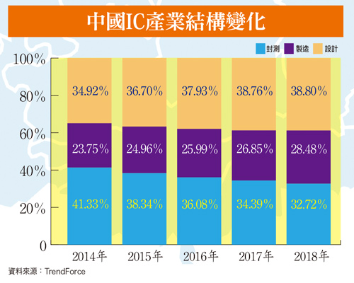 以中國半導體產業結構區分而言,中國IC設計業產值占整體半導體產值比重,去年首次超越封測產業。未來二年內,預估於雙鏡頭、AMOLED、指紋辨識、人臉辨識、物聯網等新興科技產品和技術,在AI人工智慧、5G應用市場發展帶動下,IC設計業占整體半導體產值比重,明年將持續成長達三八.八%,穩坐第一寶座。在IC製造方面,目前中國共有十二吋晶圓廠二十二座。其中,興建中有十一座;八吋晶圓廠共有十八座,在興建中的有五座,預估明年將會陸續有更多座晶圓新廠進入量產階段,整體產值規模也將進一步攀升,因此推升IC製造次產業占整體半導體產值比重,明年將快速拉高達二八.四八%。IC封測產業因受惠先進技術升級、產業群聚效應驅動,伴隨新建立廠房、生產線,陸續投產、量產供貨正常營運下,中國本土半導體封測廠,高階封裝技術已日益成熟,IC晶片封裝代工服務訂單接單量亦日漸成長帶動下,預估未來二年內,中國IC封測業整體產值年成長率,仍將維持原有二位數水準不墜。中國官方長期投注大量資源發展的汽車製造、半導體等產業,已相繼開花結果,逐步實現官方所設定產業發展目標。