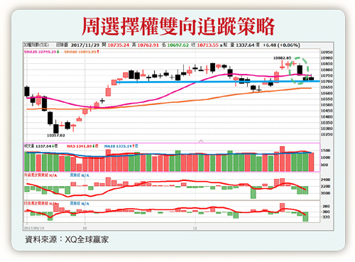 第四季出口增溫帶動,主計處十一月二十四日公布的全年度GDP也上調至二.五八%。從基本面來看,台灣經濟成長仍然強勁,但國外法人觀點就有所不同。二十六日摩根史丹利一份報告下修全球半導體需求,指出台積電的利多皆已反映在股價,加上明年HPC晶片需求預期將會減緩,因此將台積電評等調降至中立。作為台股多頭主要推手的台積電評價遭到下修,半導體族群股價自然跟著向下修正。加上台股現在已位於高檔,消息面一點風吹草動都會帶動獲利賣壓出籠。不過從台幣匯率來看,近期美元對台幣仍維持在三十元附近,並未出現資金移出現象,由於年底外資進入年度結算,操作意願將會降低,台股後市將由外資轉為內資主導。從技術面來看,二十七日受大摩報告影響,電子權值股紛紛向下修正,大盤回測一○七○○點。從籌碼面觀察,外資期貨未平倉部位,二十九日淨多單四萬二千多口,維持在相對較低水平。