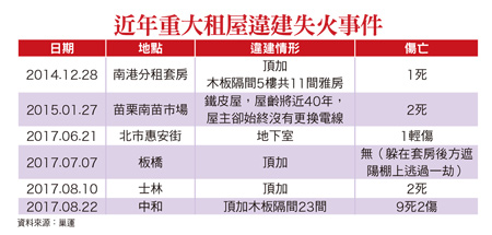 巢運點出出租房違規問題嚴重長期關心住宅安全的「巢運」團體指出,此次大火絕非偶發事件,單是今年已有數次租屋祝融之災,造成多人死傷(見附表),顯見我國的租屋安全問題宛如地雷,不知何時、何地就會引爆!「巢運」表示,每次相似的悲劇過後,政府都會允諾徹查消安及違建,司法警政單位亦介入調查,釐清責任歸屬,卻阻止不了憾事一再發生!而我國首部租屋專門法案《租賃住宅市場發展條例》,雖於十一月二十八日經立法院三讀通過,但長期關心社會居住問題的巢運代表、專家及立委,仍點出以下問題,呼籲各界正視此次事件的根本成因;亦提醒租屋條例僅是起點,政府應儘速啟動租屋安全的結構性改革。一、政府漠視租屋市場,長期縱容地下化逃漏稅:房東逃稅、出租未登錄為常態,市場嚴重地下化,且許多屋主為彌補投報率不足,利用政府寬縱,藉由逃稅、違建、不設消防安全設備等方式來降低成本。二、就最基本的租屋安全與品質,從不過問,竟只能仰賴建築法規,而且落實上根本形同虛設:這次大火,即使有各種成因,但直接導致如此慘重傷亡,仍在於建築管理制度出大問題。該出租套房僅四、五兩層樓即隔二十多間收租,絲毫不顧及隔火和逃生路線,成為名副其實的「棺材房」。然現有的租賃法規中,無論《民法》、《租屋條例》或《應記載及不得記載事項》,均無法禁止違建房屋出租。三、危險租屋的受害者多為社會底層,也是政府多年錯誤住宅政策下,最直接被犧牲的群體:租屋市場的承租方多是學生、年輕上班族及弱勢家庭。年輕人以購屋為目標,暫時屈身頂加等窳陋、危險處,一則缺乏危機意識,二則這是社會的普遍價值觀(吃苦只為購屋)。但也有許多弱勢房客,常被一般市場排擠而「租不起且租不到」,不得不蝸居在租屋市場的底層,這也是此次大火罹難者和倖存者的共通背景。