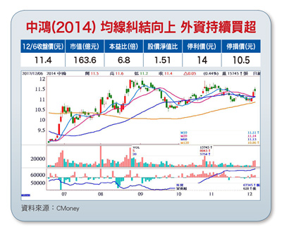 美國參議院通過川普稅改,激勵道瓊和S&P500指數再創歷史新高,但美科技股受惠不大,仍持續下修中。台股在創下一○八八二新高後,即提醒大家小心再下來回測季線至半年線間,在電子股相對弱勢、跌破半年線支撐拖累下,大盤十二月六日跌破半年線收一○三九三點。後勢短線有反彈須特別觀察一○六五○至一○六九七空方缺口是否回補,若無法回補得提防是弱勢反彈,則反彈完就會下去破底清洗融資浮額,回測年線到十月均線一○一○○至一○三五○。若能回補則來到一○七○○至一○八○○也還會再下來整理,如此至少到年底前才有機會在一○五○○至一○八○○區間震盪,待均線糾結後再上。波段而言一定還要整理,快則年底年初,慢則過年前整理完再上攻一波。現階段選股和資金控管很重要。中鴻(2014)前三季賺一.○一元,國際鋼價仍在高檔,十月內銷盤價全面調漲熱軋、冷軋及熱浸鍍鋅鋼捲價格,每公噸漲六百至八百元,並調漲十一月熱軋與冷軋外銷價,每公噸漲二十五至三十美元。雖然十一至十二月盤價反應國際鋼價於高檔持穩態勢,維持平盤,但煤鐵礦原料成本仍處於低檔,第四季產品利差將較上一季擴大。法人認為目前大陸嚴格執行冬季環保限產政策,供給持續偏緊,使鋼價行情維持高檔,應有利中鴻業績表現。加上接獲美國頁岩油API輸油氣鋼管訂單,中鴻彰濱鋼管廠單日二班運轉再加班因應,也因API輸油氣鋼管毛率高,推升中鴻第四季EPS可上看○.五元以上,全年估一.五元以上。