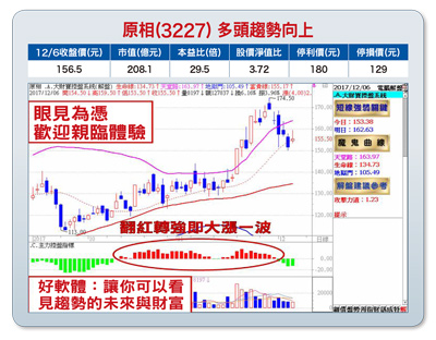 加權指數探底危機未除,受到大摩開第一槍,看壞NAND漲勢,調降權值股台積電(2330)評等和目標價,相關蘋概股大立光(3008)與可成(2474)等十一月營收旺季不旺,美科技股及費半指數反轉走跌,以及外資轉趨保守並反手調節持股,市場再度陷入恐慌與不安的情緒,不過,台股並沒有如大家所想像的那麼差,為什麼?恐慌性賣壓大舉出籠 留意多頭絕地大反攻機會一、就整體景氣面來看,歐美景氣持續復甦向上力道仍相當強勁,中國經濟可望回穩向上,加上蘋果iPhone X遞延效應,以及AI人工智慧、3D感測、電動車、5G網路、高速運算等新應用題材快速發展帶動下,國內景氣亦可望維持穩步復甦成長格局,對台股具有相當大的支撐與助力。二、雖然近期外資調節動作不斷,不過,新台幣並沒有出現急貶現象,且十一月外匯存底續創新高,顯見外資逢高調節資金仍持續停留在本土市場,未大舉匯出,而是在等待最佳時機再伺機而動。三、政策面積極偏多心態未改變,尤其每當市場恐慌性賣壓大舉出籠後,隨之而來的就是另一波嶄新大好機會的開始,不論是八月十四日一○二二五點或九月二十六日一○二五七點低檔絕佳大買點時機都是一樣。因此,雖然目前探底危機尚未完全解除,隨著恐慌性賣壓出籠,指數已逐步逼近前低一○三五○頸線支撐區附近,台股也將隨時可望止穩並展開新一波強彈機會。【個股推薦】原相(3227)為全球CMOS影像感測器領導廠商之一,國內唯一可自主開發完整CMOS Sensor晶片及相關應用SOC單晶片之本土公司。主要利基題材有:(1)任天堂Switch發威,第三季EPS躍七年新高:受惠任天堂Switch全球熱銷,原相第三季營收一三.八九億元,季增七.三%,年增二五.三%,毛利率五六.七%,稅後淨利二.二四億元,季增二七.五%,年增更是逾七倍之多,EPS一.八三元,寫下七年新高,累計前三季EPS達三.九六元,已大大超越去年全年獲利一.二元。發言人羅美煒表示,帶動主要成長貢獻的就是遊戲機產品線成長超過二○%,安防監控等產品也同步成長。