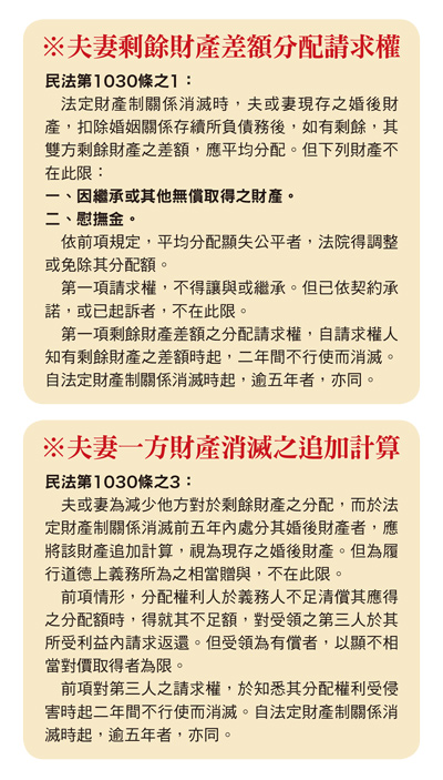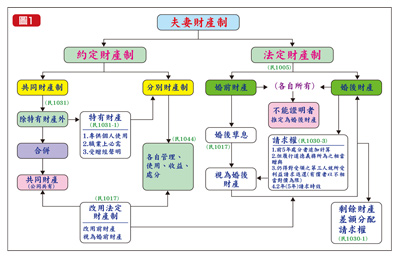 夫妻若爭產 先懂民法因此,有關夫妻財產,尤其是不動產登記,奉勸要結婚的人,結婚後之財產要登記在誰名下,頭期款及房貸的負擔比例等等,最好都要談清楚,而為了預防人財兩失,若能簽婚前協議,並經公證的話,更能確保萬一。 此外,有關婚姻財產之規定及相關稅捐,都跟《民法》及《地政法規》有關,建議大家平時能多翻讀或與地政士(代書)或律師朋友多加研究,懂愈多,愈能確保自己的權益。舉例來說,遠東航空董事長張綱維在多年前,就曾經打官司,成功討回贈送給未婚妻的兩棟房屋及千萬鑽戒,勝訴的關鍵就在於,他係以「結婚」為前提而贈與,屬於《民法》第九七九條之一規定的「因訂婚之贈與」,而女方因一些因素要求退婚,等同「婚約解除」,因此,張綱維「請求返還」的官司得以勝訴。最近因老公郭宗坤與女員工傳緋聞,而鬧婚變的藝人柯以柔,據媒體報導,其在婚後六年共搬了七次家,多次置產買房的她,可能知悉老公有外遇傾向,因而要老公簽署一份「財產分離書」,以確保她所買的房地產屬於她所有,沒想到,竟造成老公搬出住家,婚姻岌岌可危。是柯以柔的「保產」動作,更加撕裂夫妻間的信任?還是,傷透的心,不再對另一半抱有希望,進而採取「自我保護」的動作?內情恐怕只有當事人明瞭,但由柯以柔的例子,卻能從《民法》的相關規定來談談夫妻間的財產攻防戰。有關夫妻的財產制規定,依民法第一○○四條:「夫妻得於結婚前或結婚後,以契約就本法所定之約定財產制中,選擇其一,為其夫妻財產制。 」第一○○五條:「夫妻未以契約訂立夫妻財產制者,除本法另有規定外,以法定財產制,為其夫妻財產制。 」(如附圖一)搞懂夫妻財產制 很重要「約定財產制」還可分為「分別財產制」及「共同財產制」,所謂的「分別財產制」,說白話些,就是你的財產是你的,我的財產是我的,夫妻各自管理、使用、收益及處分。而「共同財產制」則是除了特有財產(有專供個人使用、職業上必需及受贈經聲明等三種)外,你的財產跟我的財產合在一起,屬於夫妻公同共有的共同財產。至於「法定財產制」則有婚前財產及婚後財產,顧名思義,結婚前的財產屬於夫妻(男女)各自擁有,婚後所賺的錢、投資或置產的種種獲利都屬於婚後的財產。但要特別注意的是,屬於婚前財產,在婚後的孳息,則視為婚後財產,舉例來說,太太在婚前有房子出租,結婚後,房子仍屬於太太的,但婚後所收的租金,就要算夫妻婚後的財產。另外,不能證明是婚前的財產,則推定為婚後財產。根據民國九十一年修正後的民法,如果夫妻在婚前或婚後未擇定「約定財產制」,且向法院登記或公證的話,都屬於「法定財產制」;說白話些的就是,夫妻沒向法院主張「約定財產制」的,都是「法定財產制」,而依目前的情況來看,有百分之九十以上的夫妻都屬於這種。而會擇定「約定財產制」者,可能是男女雙方在婚前的財力就相差懸殊,或有其他因素之故;例如,為鴻海集團董事長郭台銘生下一女二子的曾馨瑩在結婚前,雙方就登記「分別財產制」,也就是各自擁有自己名下的財產。