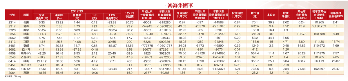 儘管十一月二十六日大型外資法人機構摩根士丹利(大摩)發布一篇投資分析報告,將台積電投資評等調降至「中立」、目標價二三九元,明顯偏空看待台積電後市,唯其實多數外資仍對台積電後市營運前景相當有信心。以某亞系外資為例,即看好台積電「十六奈米」、「七奈米」製程,後市可望搶占全球「車用半導體」晶片代工市場。至二○一九年時,台積電車用半導體營收複合年平均成長率(CAGR)將達一五%。同時,也肯定台積電「極紫外光(EUV)」先進光罩微影製程高階技術的成功突破,有利未來降低晶圓代工成本,同時進一步強化營運成長動能,表現優於業界平均水準,將投資目標價上調達三百元。無獨有偶,知名外資法人麥格理,也以同樣理由看多台積電後市,目標價同樣上調至三百元。完整布局全球市場 鴻海隨時重啟漲勢目前已成為全球消費性電子大廠的蘋果(Apple),其智慧型手機在內的行動電子裝置的零組件供應、組裝,已有約達五○%以上營收比重,主要來自「鴻海集團」,該集團也同時為亞馬遜代工生產Kindle電子書、Echo智慧音箱。