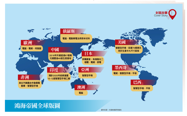 同時,基於分散營運風險,擴充產品應用領域的核心策略考量,鴻海集團現階段正逐漸降低為蘋果代工比重。近幾年來,正持續增加高階、新世代TFT-LCD面板廠投資規模,更進一步搶進新世代薄型顯示器─OLED面板產製領域,試圖力拚現階段全球OLED市場霸主─韓廠三星SDI、LGD。另一方面,目前亦已於電池、電機製造相關技術領域獲有成熟的研製經驗,躍為全球電動車大廠的特斯拉,已有多達一○六個車輛零配件,委由鴻海集團負責供貨。同時,鴻海重要策略合作夥伴─日商軟銀(SoftBank),目前亦已於市場上販售委由鴻海代工的服務機器人「Pepper」,且獲得好評並擴大出貨中。同時,也正積極跨足含中國應用市場在內的全球自動化與智慧4.0市場商機。由此不難想見,先前即已與全球AI應用市場領域的龍頭大廠建立良好合作關係的鴻海集團,等同已成功搶下包含行動電子、物聯網裝置、智慧製造、服務型機器人、自駕車等AI應用市場領域的零組件供貨、代工及組裝服務(EMS),後續市場龐大商機。知名外資機構─麥格理證券,於先前所發出厚達二二六頁有關「鴻海集團」大部頭報告中,預言鴻海將成為未來世界整合者(Integrator for Tomorrow’s World),完整揭露鴻海集團現有「九大事業群、全球布局版圖、四大競爭優勢、四大新市場領域」詳細資訊。鴻海目前九大核心事業群分別是:(一)手機組裝事業,(二)PC與伺服器,(三)電視、面板與遊戲機,(四)網路設備,(五)連接器,(六)通路與電商,(七)醫療生技,(八)電動車,(九)機器人與無人機。其中,第六項、第七項,現階段占鴻海整體營收比重皆不及一%,機器人、電動車、無人機等事業群也尚處初步階段,但麥格理證券特別看重機器人、電動車等應用產業大趨勢,將成為鴻海集團未來最重要獲利支柱。麥格理證券將鴻海最新全球布局據點統合整理後,清楚勾勒出一個事業版圖,橫跨北美洲、歐洲、亞洲、南美洲、非洲、澳洲,「鴻海足跡」透露出全球經濟脈動走勢,亦凸顯出鴻海迅速觸及客戶、市場的特點,以及後市受惠來自全球市場,同步灌注整體營運成長動能之可能性。
