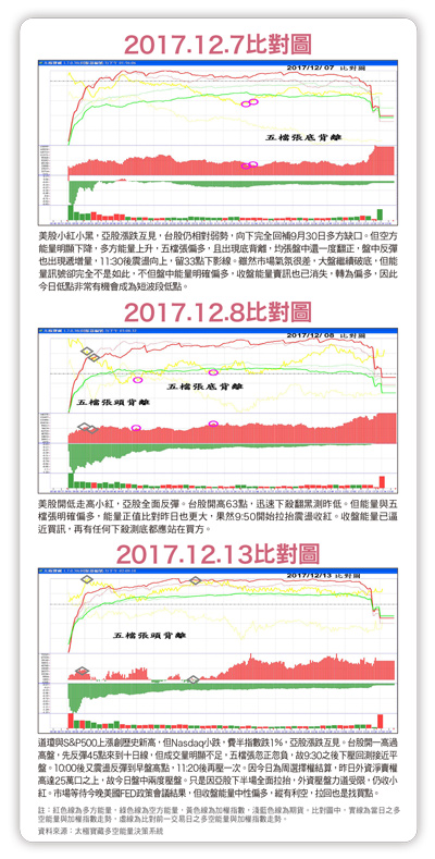 亞股幾乎全壓回,小黑到小中黑。台股開高二十二點,但空方能量大增、多方能量衰退,故一路下壓到一○四○八點,果然回測一○四一○點附近支撐。所幸,能量維持正值,五檔張正值擴大,留三十五點下影線收小黑。回測支撐成功力守,又有向上的機會。>十二月十三日道瓊與S&P500上漲創歷史新高,但Nasdaq小跌,費半指數跌一%,亞股漲跌互見。台股開一高過高盤,先反彈四十五點來到十日線,但成交量明顯不足,五檔張忽正忽負,故九點三十分之後下壓回測接近平盤。十點後又震盪反彈到早盤高點,十一點二十分後再壓一次。因當天為周選擇權結算,前一天外資淨賣權高達二十五萬口之上,故十三日盤中兩度壓盤。只是因亞股下半場全面拉抬,外資壓盤力道受限,仍收小紅。市場等待當晚美國FED政策會議結果,但收盤能量中性偏多,縱有利空,拉回也是找買點。上周到本周為五、十三、三十四的多重時間轉折,配合能量,應可確認一○三二二點為本波中期回檔的A波下跌低點,將就此展開B波反彈,少則三周、多則五周,之後還有C波下跌。我預計在農曆春節封關前,見到C波低點,完成中期回檔,展開千點以上(甚至有可能超過二千點)的末升段大行情,時間少則三至四個月,多則可長達五個月以上。先在此提出預測,供各位參考。